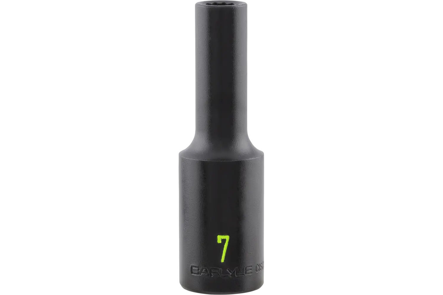 The Carlyle 3/8 in. Drive Impact Sockets are designed for durability and precision. Available in various depths and configurations, they feature a radius-cornered design to reduce wear and enhance grip. Made with CR-V material and a polished chrome finish, these sockets resist rust and provide reliable performance for demanding tasks.