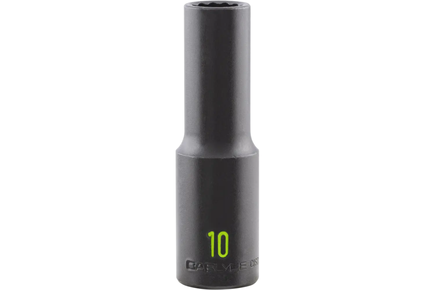 The Carlyle 3/8 in. Drive Impact Sockets are designed for durability and precision. Available in various depths and configurations, they feature a radius-cornered design to reduce wear and enhance grip. Made with CR-V material and a polished chrome finish, these sockets resist rust and provide reliable performance for demanding tasks.