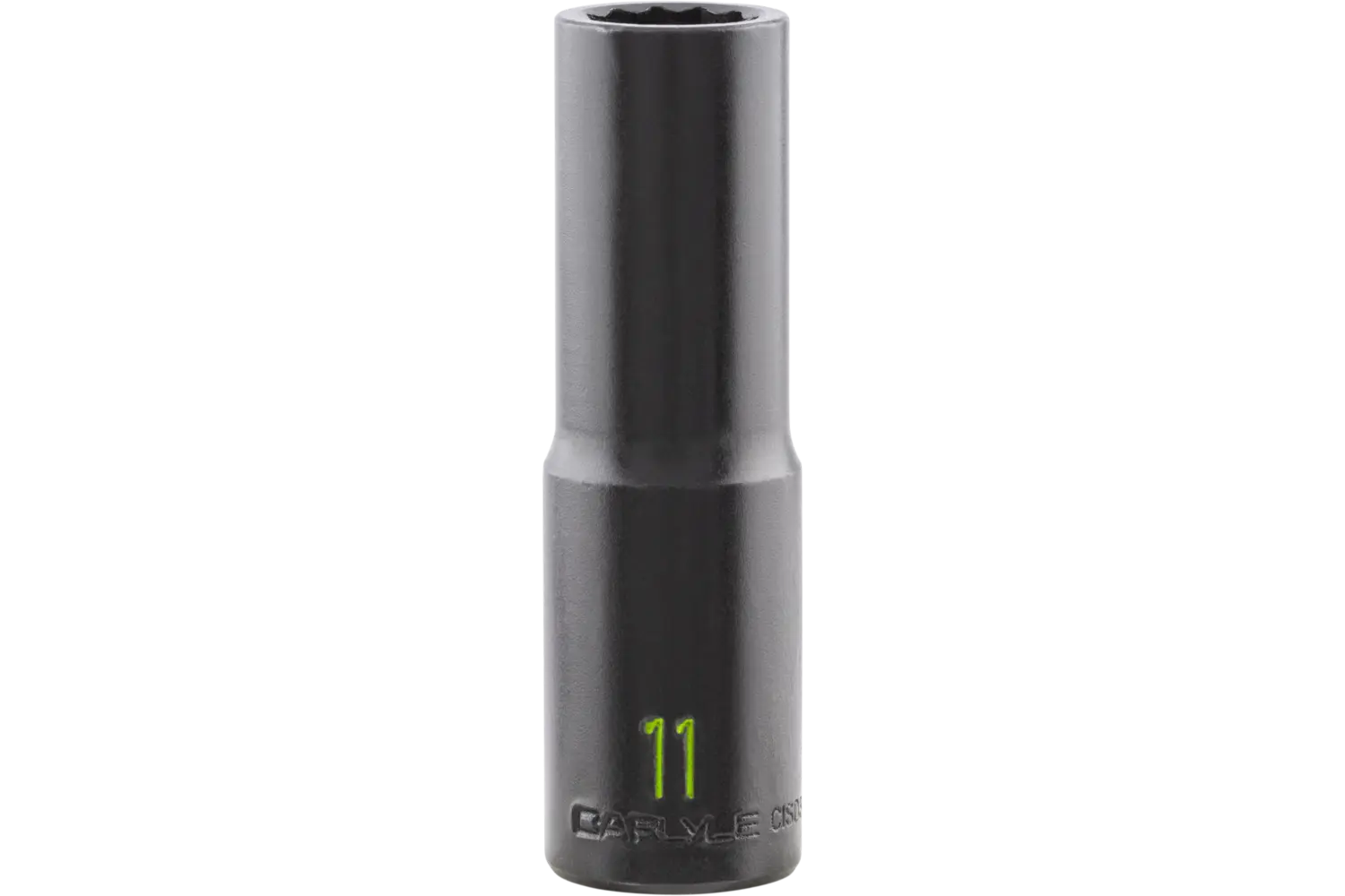 The Carlyle 3/8 in. Drive Impact Sockets are designed for durability and precision. Available in various depths and configurations, they feature a radius-cornered design to reduce wear and enhance grip. Made with CR-V material and a polished chrome finish, these sockets resist rust and provide reliable performance for demanding tasks.