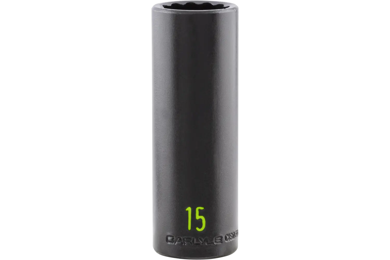 The Carlyle 3/8 in. Drive Impact Sockets are designed for durability and precision. Available in various depths and configurations, they feature a radius-cornered design to reduce wear and enhance grip. Made with CR-V material and a polished chrome finish, these sockets resist rust and provide reliable performance for demanding tasks.