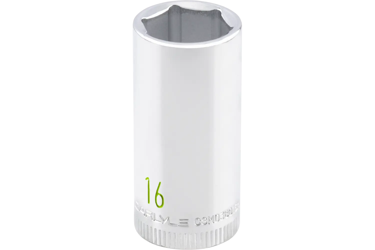 The Carlyle 3/8 in. Drive Impact Sockets are designed for durability and precision. Available in various depths and configurations, they feature a radius-cornered design to reduce wear and enhance grip. Made with CR-V material and a polished chrome finish, these sockets resist rust and provide reliable performance for demanding tasks.