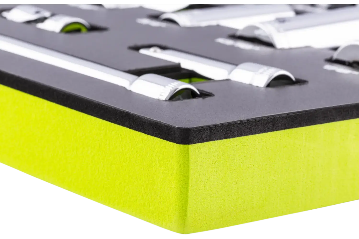 Standard (1/4in, 5/16in, 3/8in, 7/16in, 1/2in, 9/16in, 5/8in, 11/16in, 3/4in, 13/16in, 7/8in, 8mm, 9mm, 10mm, 11mm, 12mm, 13mm, 14mm, 15mm, 16mm, 17mm, 19mm), Deep (1/4in, 5/16in, 3/8in, 7/16in, 1/2in, 9/16in, 5/8in, 11/16in, 3/4in, 13/16in, 7/8in, 8mm, 9mm, 10mm, 11mm, 12mm, 13mm, 14mm, 15mm, 16mm, 17mm, 19mm), 3/8in Drive 90-Tooth Ratchet, 3in Length, 10in Length, 3/8in Drive U-Joint, 3/8in Drive 8in Breaker Bar Chrome 12 Point Standard & Deep 49 PC EVA Foam