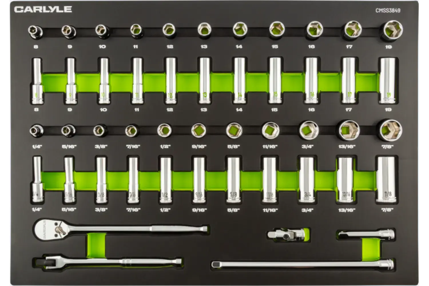 The Carlyle 49 piece mechanics socket tool set is an excellent tool set to add to my collection. I like that it comes with both metric and SAE sizes. Having deep and shallow sockets are great and come in handy depending on what I am working in. The ratchet is smooth while ratcheting. I like how you can keep everything organized in the tool tray. The only complaint is that the tool tray doesn't fit in my toolbox drawer.