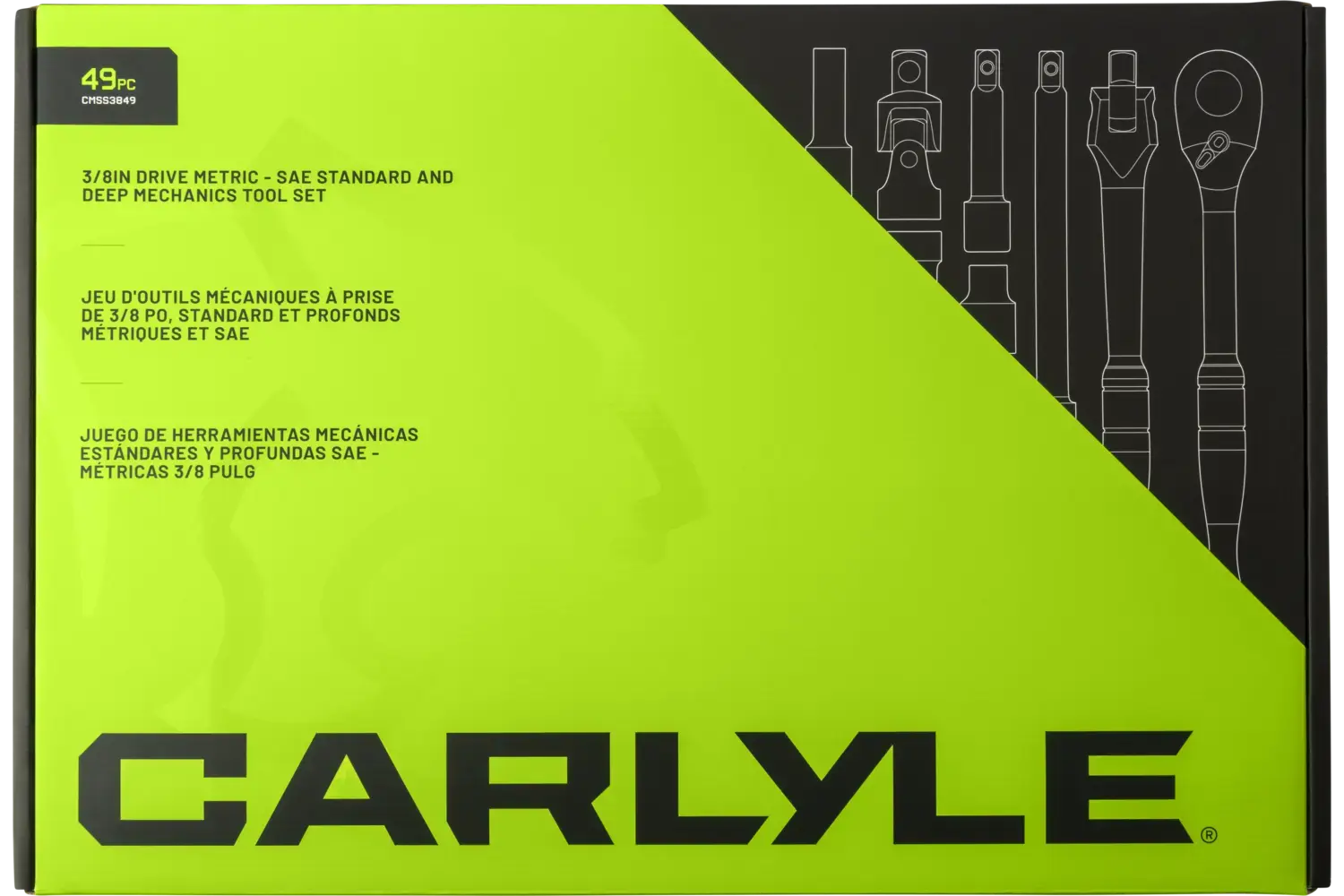 The Carlyle 3/8 in. Drive Mixed Depths 6 pt. Chrome Socket and Ratchet Set - SAE & Metric is a comprehensive 49-piece toolset designed for professionals and DIYers who demand versatility and durability. Crafted from tough chrome vanadium alloy steel, this set is built to handle serious torque while maintaining long-lasting performance. The highly polished chrome-plated finish resists rust and corrosion, ensuring the tools stay reliable in harsh conditions. The knurled teeth on the ratchet provide a confident grip, while the radius corner design on the sockets offers better torque and reduces wear on fasteners. Complete with chamfered drive openings for smooth connections, this set is perfect for tackling a wide range of tasks with precision and efficiency.
