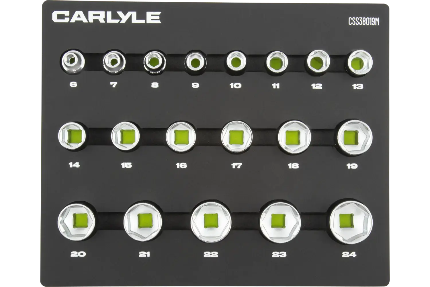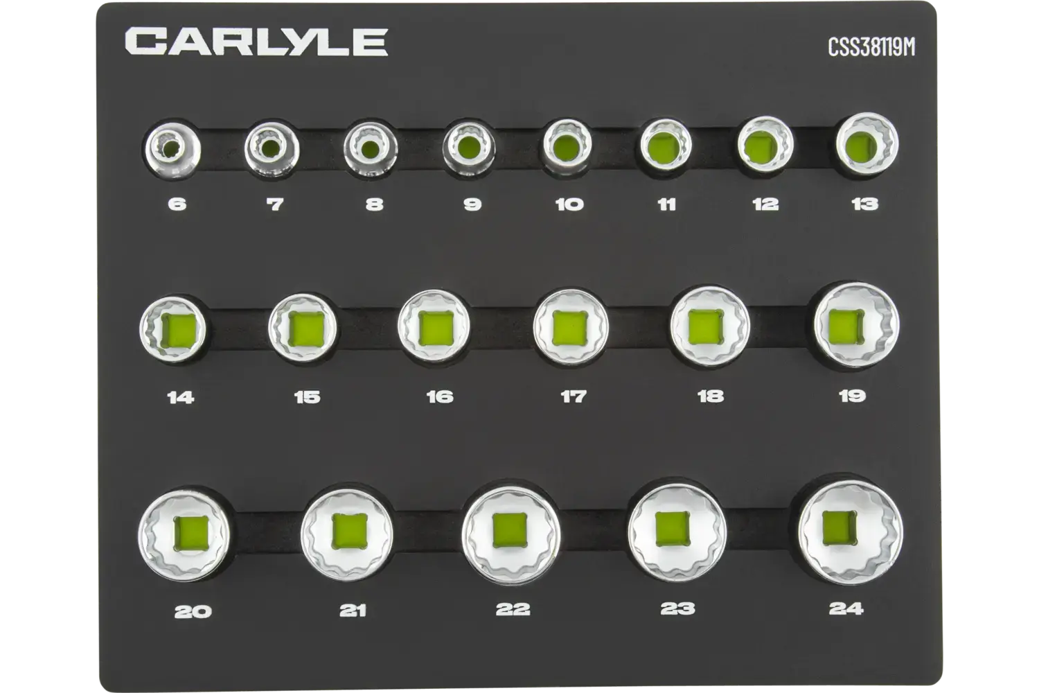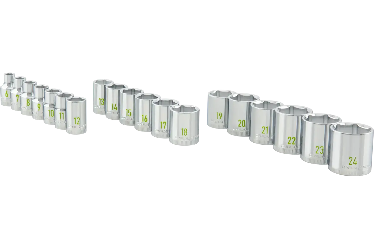 | 6mm, 7mm, 8mm, 9mm, 10mm, 11mm, 12mm, 13mm, 14mm, 15mm, 16mm, 17mm, 18mm, 19mm, 20mm, 21mm, 22mm, 23mm, 24mm | Chrome | 12 Point | Standard | 19 PC | EVA Foam |