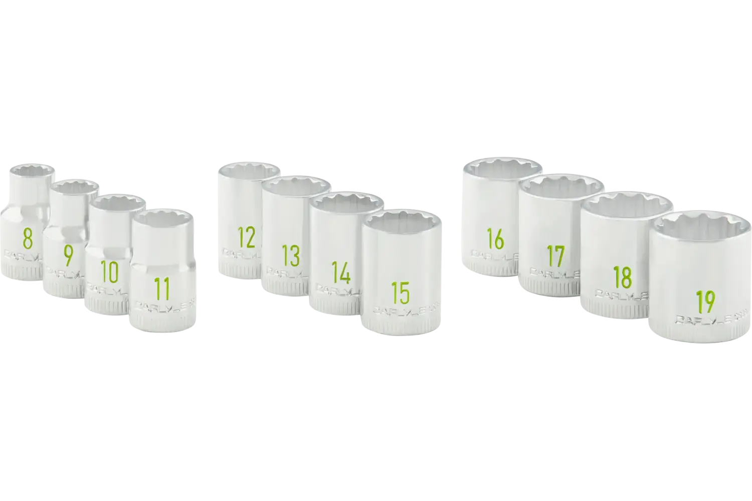| 8mm, 9mm, 10mm, 11mm, 12mm, 13mm, 14mm, 15mm, 16mm, 17mm, 18mm, 19mm | Chrome | 12 Point | Standard | 12 PC | EVA Foam | |