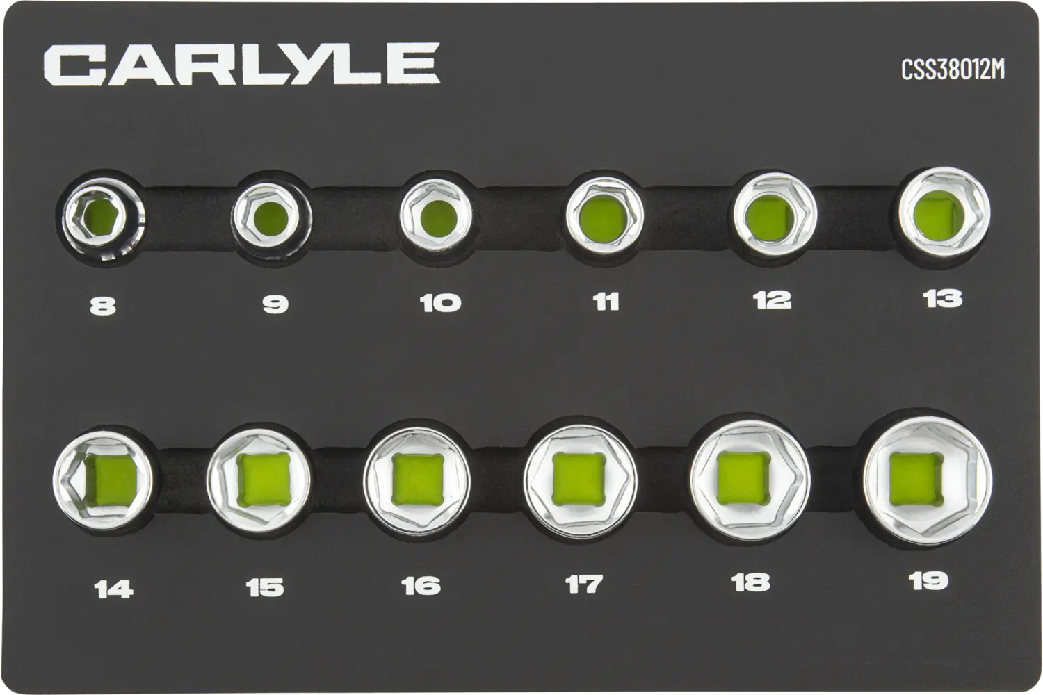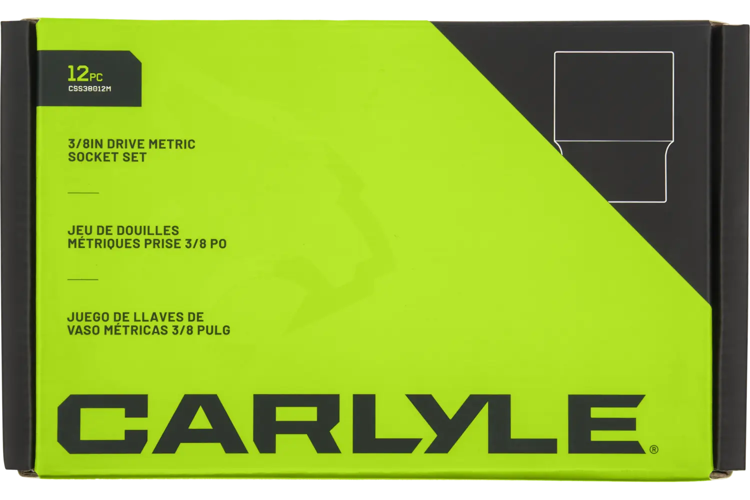 Built with superior quality and designed with input from industry pros, the Carlyle 3/8 in. Drive Standard Depth Chrome Socket Set - Metric delivers high performance and dependability, even in the harshest work environments. Engineered with a highly polished chrome-plated finish for outstanding rust resistance, this set combines toughness with sleek durability. The radius-cornered 12-point or 6-point socket design provides better fastener control and reduces wear, while the 60-tooth teardrop ratchet, extensions, flex handle, and universal joint offer the versatility needed to tackle any task. Housed in a rugged blow-molded case for easy organization and portability, this set gives you the power and precision you need—all at a price that works as hard as you do.