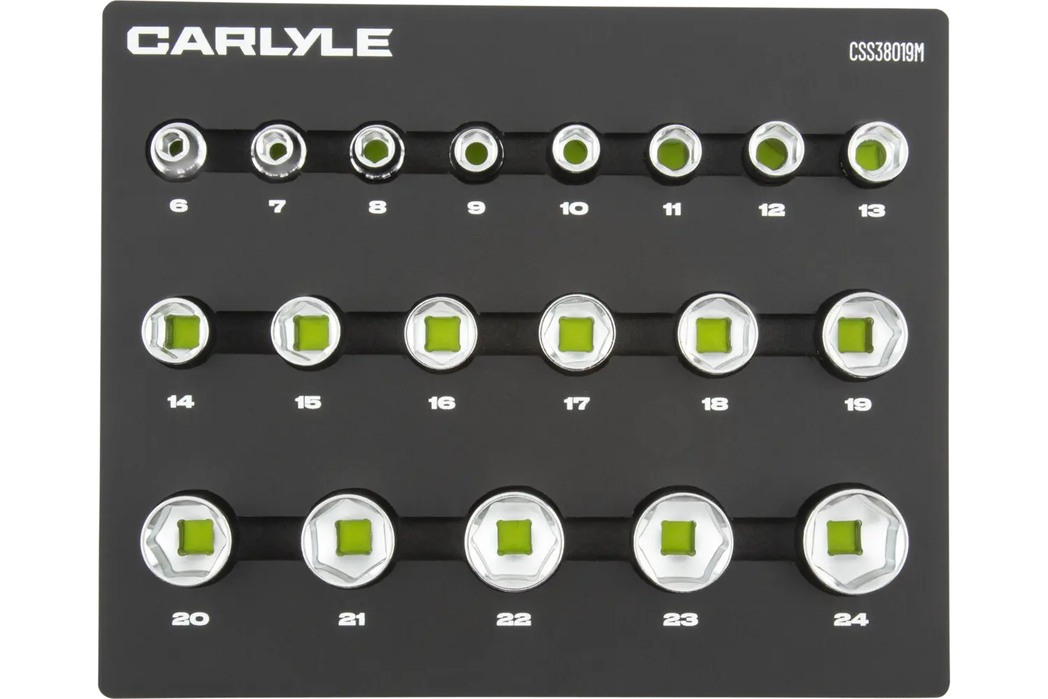 Built with superior quality and designed with input from industry pros, the Carlyle 3/8 in. Drive Standard Depth Chrome Socket Set - Metric delivers high performance and dependability, even in the harshest work environments. Engineered with a highly polished chrome-plated finish for outstanding rust resistance, this set combines toughness with sleek durability. The radius-cornered 12-point or 6-point socket design provides better fastener control and reduces wear, while the 60-tooth teardrop ratchet, extensions, flex handle, and universal joint offer the versatility needed to tackle any task. Housed in a rugged blow-molded case for easy organization and portability, this set gives you the power and precision you need—all at a price that works as hard as you do.