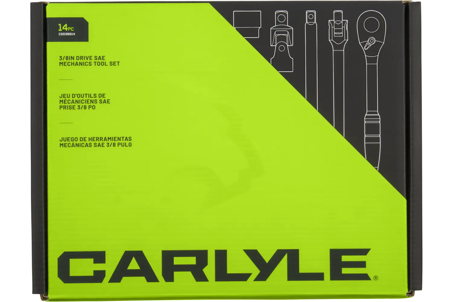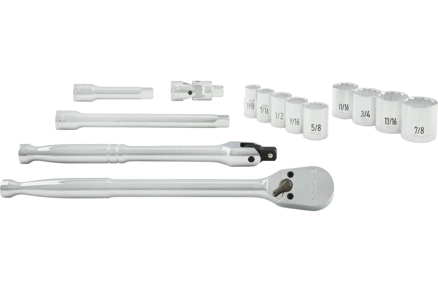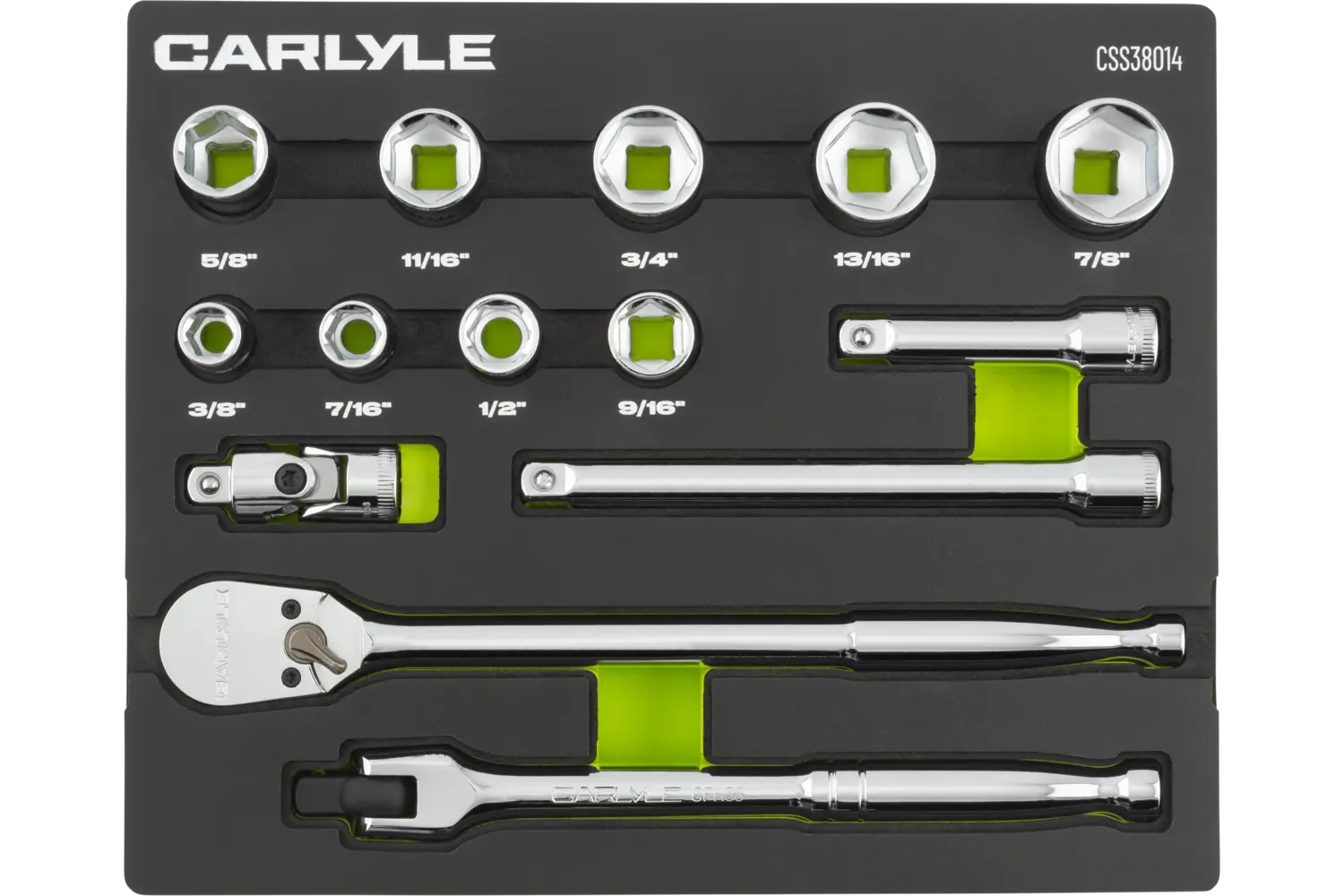 | 3/8in, 7/16in, 1/2in, 9/16in, 5/8in, 11/16in, 3/4in, 13/16in, 7/8in, 3/8in Drive 90-Tooth Ratchet, 3in Length, 6in Length, 3/8in Drive U-Joint, 3/8in Drive 8in Breaker Bar | Chrome | 12 Point | Standard | 14 PC | EVA Foam | |