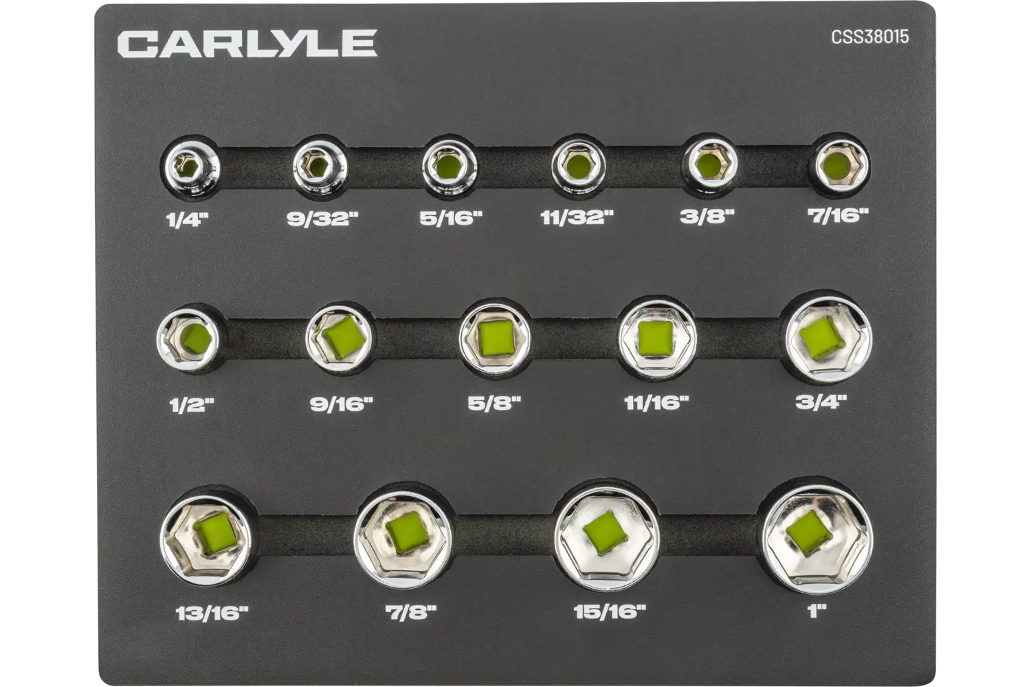 | 1/4in, 9/32in, 5/16in, 11/32in, 3/8in, 7/16in, 1/2in, 9/16in, 5/8in, 11/16in, 3/4in, 13/16in, 7/8in, 15/16in, 1in | Chrome | 12 Point | Standard | 15 PC | EVA Foam |