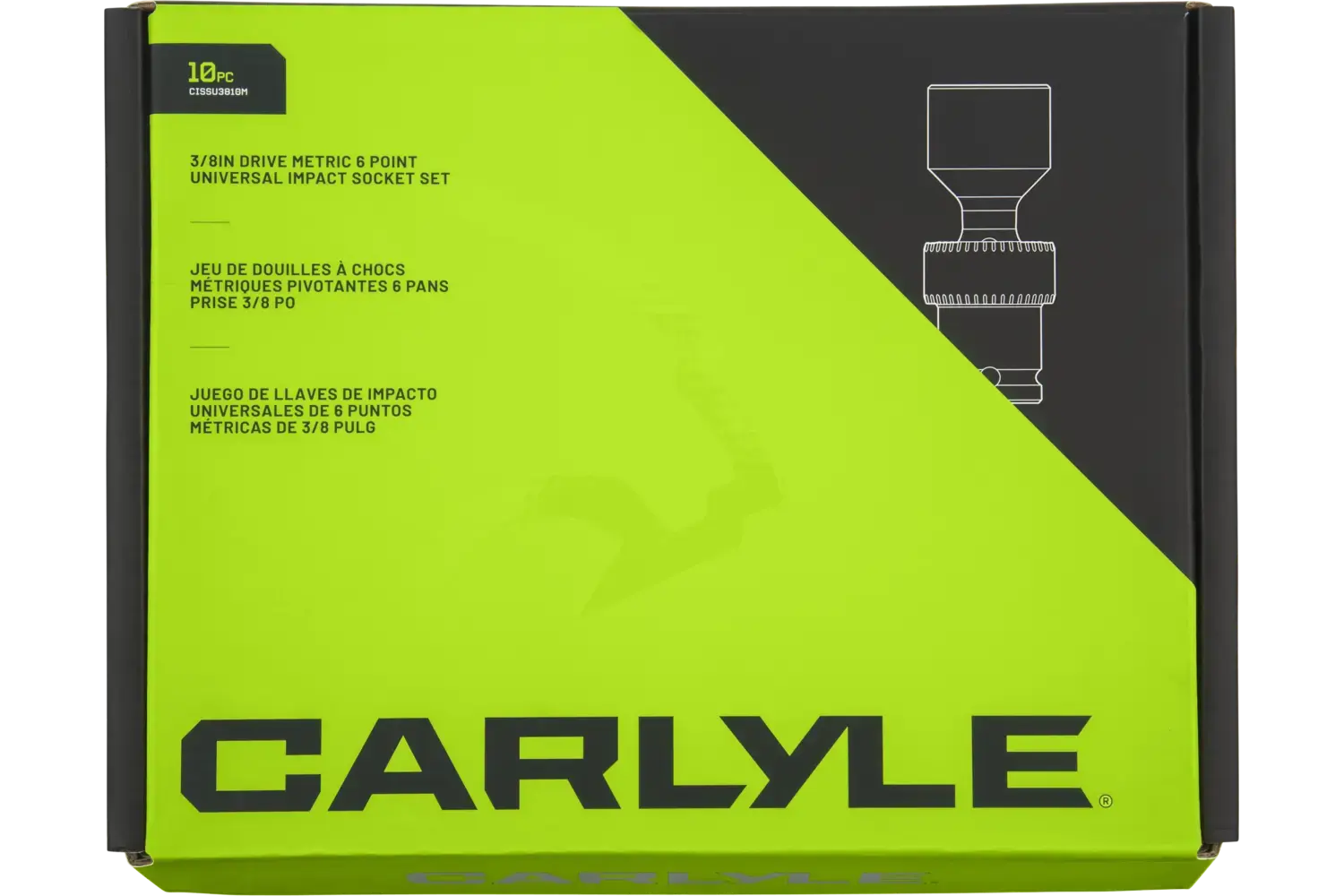 The Carlyle 3/8 in. Drive Standard-Depth Impact Universal Swivel Socket Set - Metric is engineered for strength and durability, making it a reliable tool for demanding applications. Crafted from chrome molybdenum alloy steel, this 10-piece set delivers consistent performance and long-lasting reliability. The universal swivel design provides flexibility for accessing fasteners in tight spaces, while the radius corner design offers maximum torque and reduces wear. Chamfered openings allow for quick and easy connections, and the set includes a durable storage tray for organization. Designed for professionals and DIY enthusiasts, this set is perfect for tackling tough jobs with confidence.