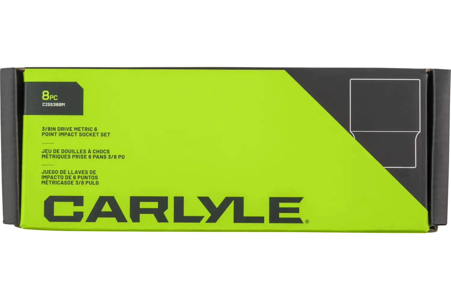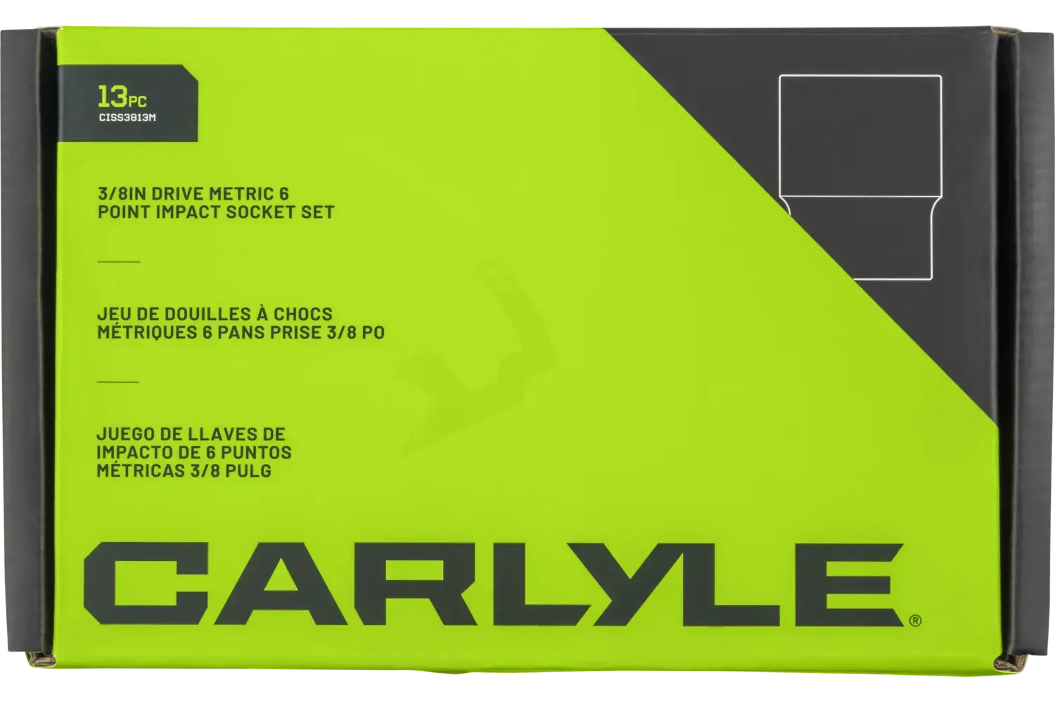 The Carlyle 3/8 in. Drive Standard Impact Socket Set - Metric is designed for durability and precision, making it an essential tool for demanding tasks. Forged from chrome molybdenum alloy steel, this set delivers exceptional strength and long-lasting performance. The radius corner design offers a secure grip on fasteners, reducing wear and preventing rounding. Chamfered openings allow for quick and easy connections, while the included storage tray keeps tools organized and accessible. Perfect for professionals and DIY enthusiasts, this set is built to handle tough jobs with efficiency.
