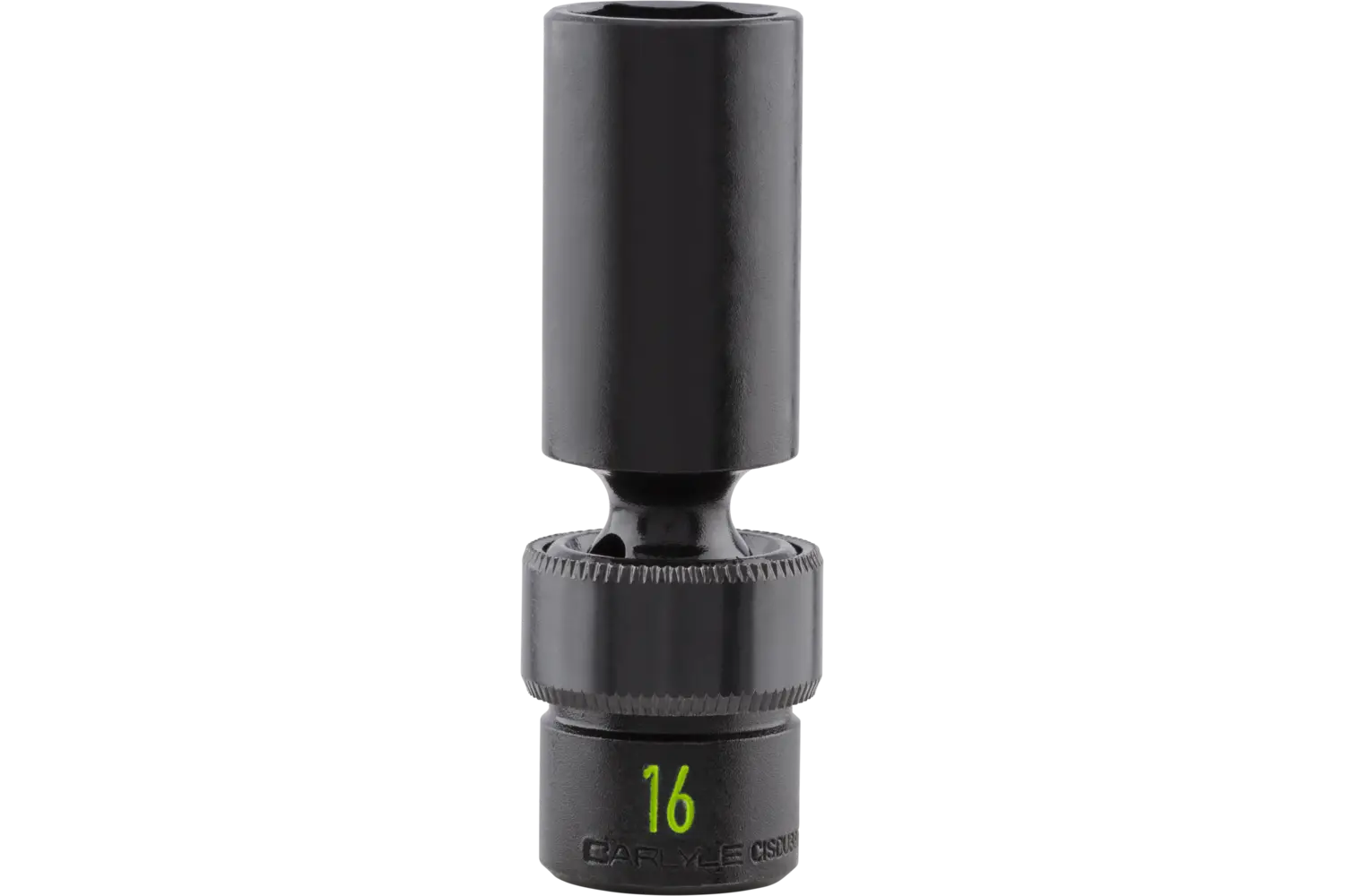 The Carlyle 3/8 in. Drive Universal Joint Impact Socket - Metric is a reliable tool for hard-to-reach areas. Crafted from chrome molybdenum alloy steel, it offers durability and precision. The radius corner design reduces wear, while chamfered openings allow for quick fastening. Finished with polished chrome, this socket is a practical choice for mechanics.