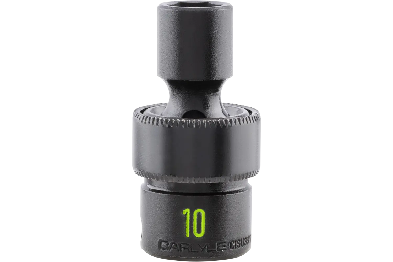 The Carlyle 3/8 in. Drive Universal Joint Impact Socket - Metric is a reliable tool for hard-to-reach areas. Crafted from chrome molybdenum alloy steel, it offers durability and precision. The radius corner design reduces wear, while chamfered openings allow for quick fastening. Finished with polished chrome, this socket is a practical choice for mechanics.
