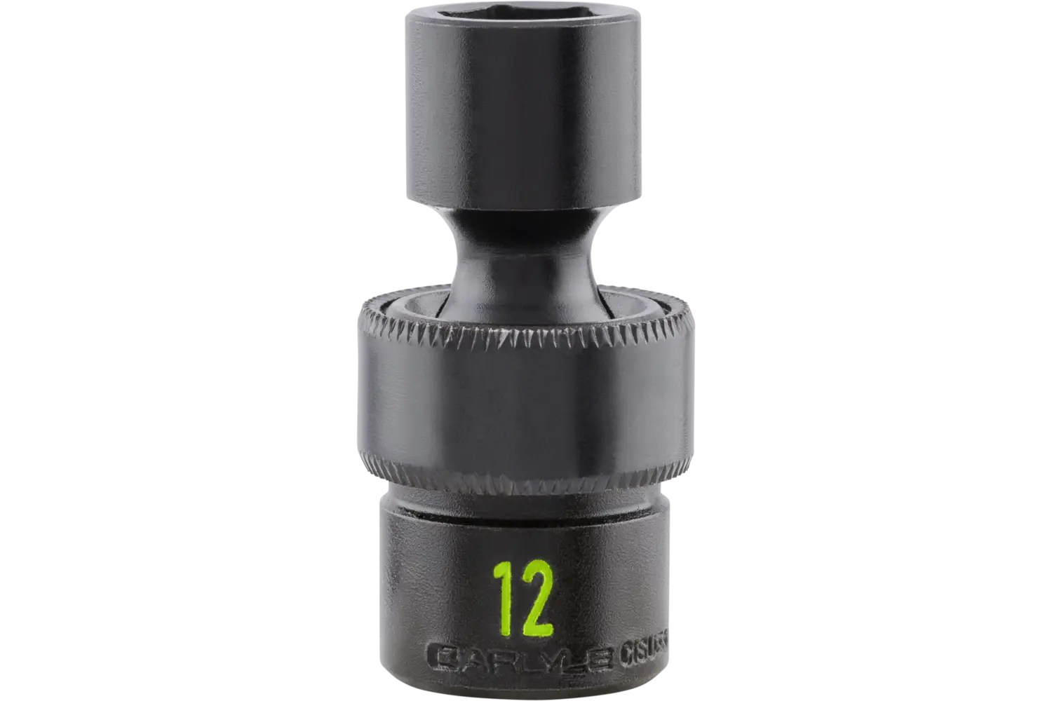 The Carlyle 3/8 in. Drive Universal Joint Impact Socket - Metric is a reliable tool for hard-to-reach areas. Crafted from chrome molybdenum alloy steel, it offers durability and precision. The radius corner design reduces wear, while chamfered openings allow for quick fastening. Finished with polished chrome, this socket is a practical choice for mechanics.