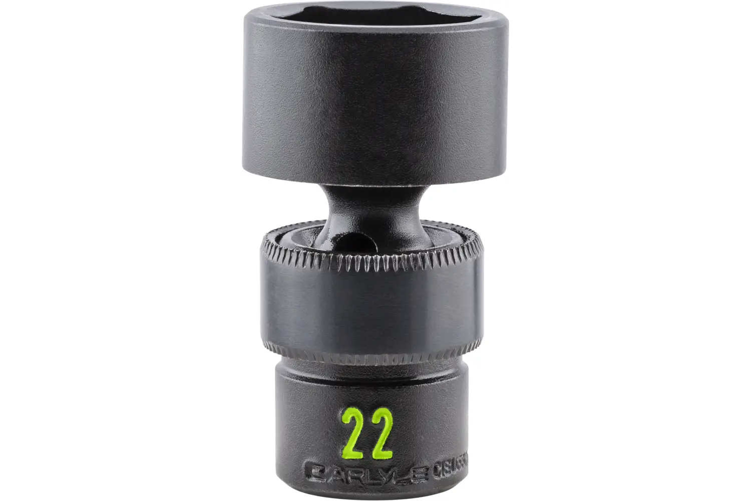 The Carlyle 3/8 in. Drive Universal Joint Impact Socket - Metric is a reliable tool for hard-to-reach areas. Crafted from chrome molybdenum alloy steel, it offers durability and precision. The radius corner design reduces wear, while chamfered openings allow for quick fastening. Finished with polished chrome, this socket is a practical choice for mechanics.