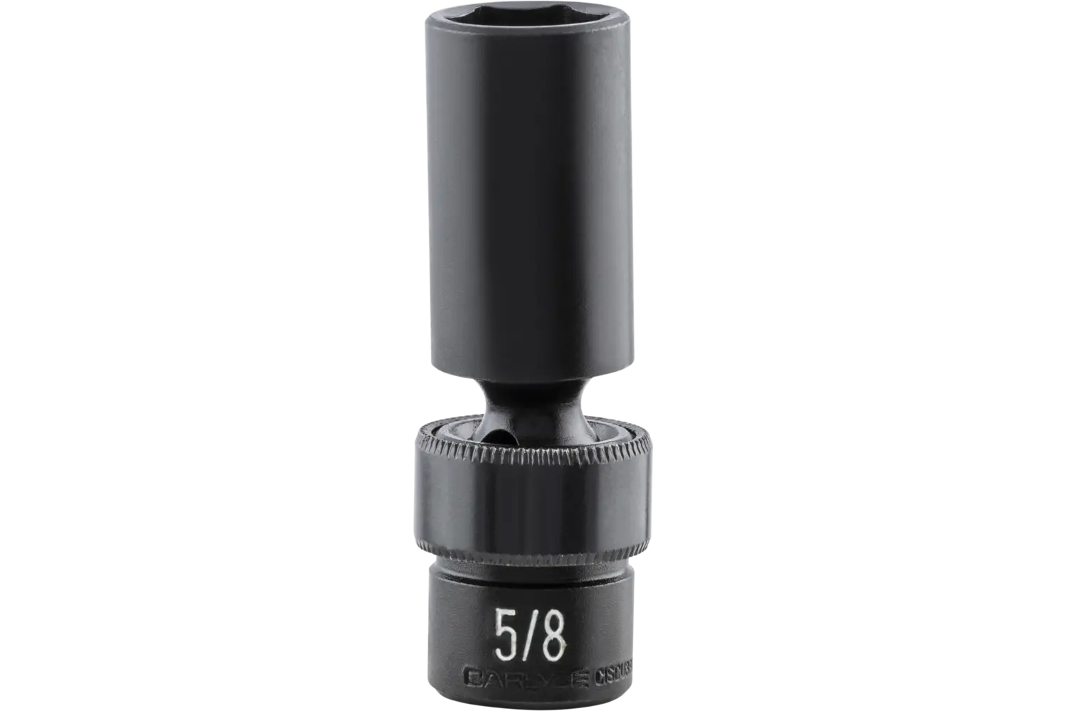 The Carlyle 3/8 in. Drive Universal Joint Impact Socket - SAE is a versatile tool for accessing tight spaces. Made from chrome molybdenum alloy steel, it offers strength and durability. The radius corner design enhances grip, while chamfered openings allow for quick fastening. With a polished chrome finish, this socket is built for demanding tasks.
