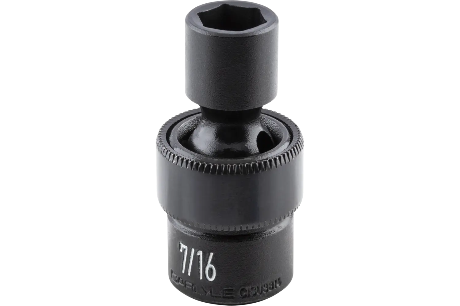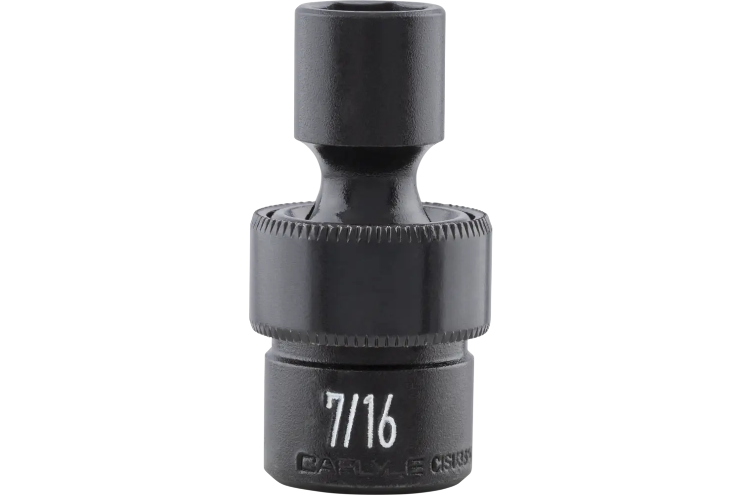 The Carlyle 3/8 in. Drive Universal Joint Impact Socket - SAE is a versatile tool for accessing tight spaces. Made from chrome molybdenum alloy steel, it offers strength and durability. The radius corner design enhances grip, while chamfered openings allow for quick fastening. With a polished chrome finish, this socket is built for demanding tasks.