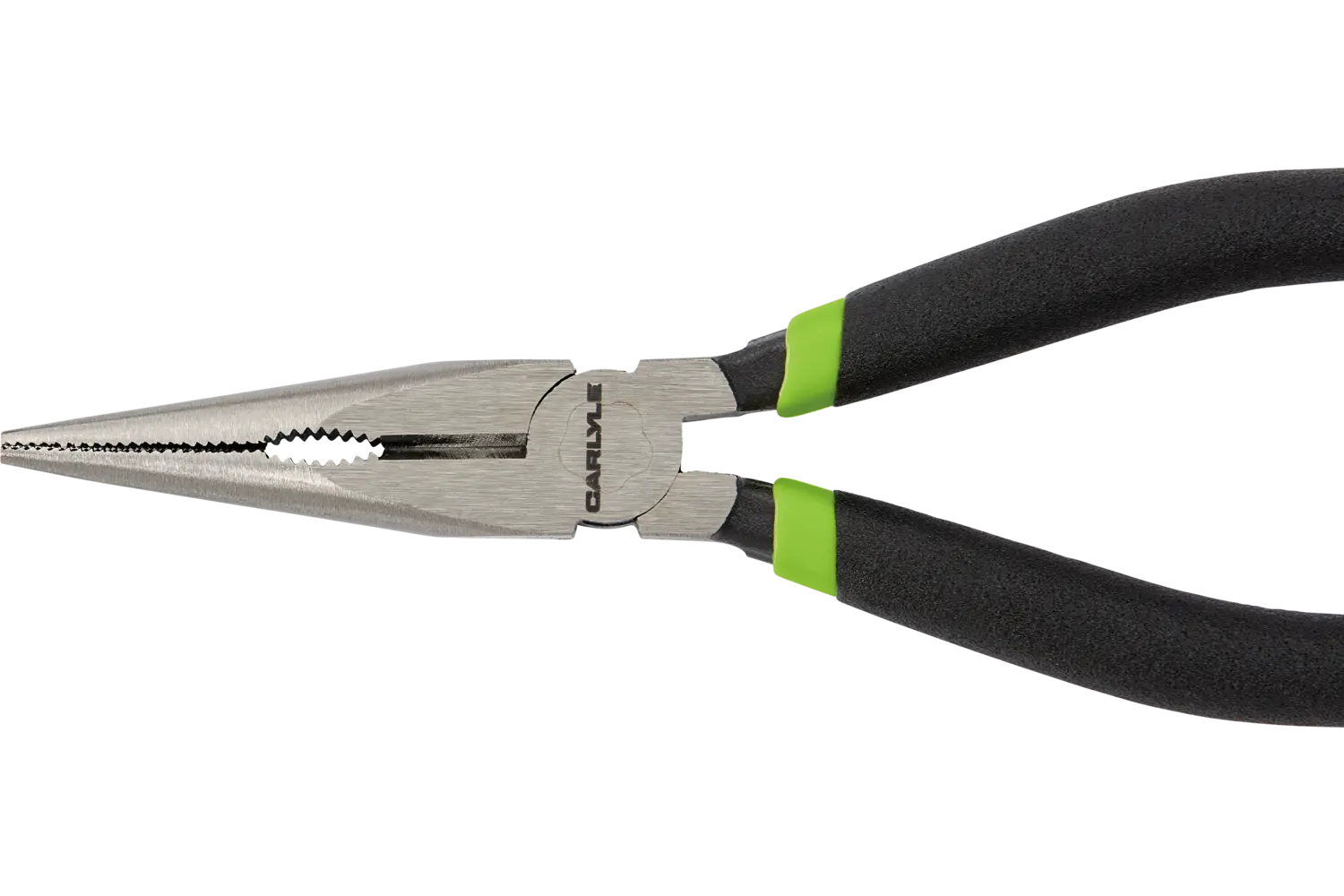 Get familiar with the versatility and precision of Carlyle Long Nose Pliers, designed to meet the diverse needs of both professional mechanics and DIY enthusiasts. Crafted from durable chrome-moly material, these pliers feature ergonomic, comfort non-slip grips that providing ease of use and reduce hand stress. Choose from a selection of curved long-nose pliers, curved needle nose pliers, mini long-nose pliers, long-nose pliers with a pistol grip, or long-nose pliers with 45° or 90° angles. Whether you need an end cut or flat nose, welding pliers, or plastic cutting pliers, Carlyle Long Nose Pliers are designed to tackle any task with confidence. The long, angled handles provide exceptional access to tight spaces, while the hardened jaws and cutting edges offer unmatched strength and durability. Go for the three-piece and four-piece sets, and enjoy features like crosshatch jaw designs for superior grip and spring-loaded handles that minimize fatigue. The lacquer finish offers exceptional rust prevention, making these pliers a reliable addition to your toolkit.