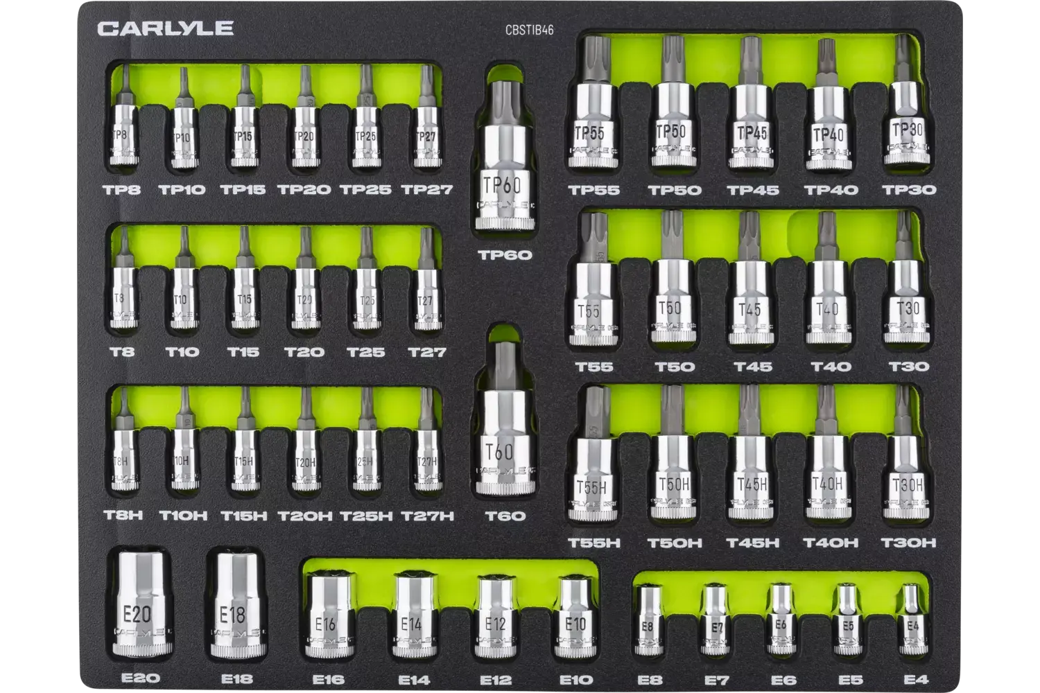 | External Star (E4, E5, E6, E7, E8, E10, E12, E14, E16, E18, E20), Star (T8, T10, T15, T20, T25, T27, T30, T40, T45, T50, T55, T60), Tamper-Proof Star (T8H, T10H, T15H, T20H, T25H, T27H, T30H, T40H, T45H, T50H, T55H), Star Plus (TP8, TP10, TP15, TP20, TP25, TP27, TP30, TP40, TP45, TP50, TP55, TP60) | Chrome | External Star, Star, Tamper-Proof Star & Star Plus | Standard | 46 PC | EVA Foam |