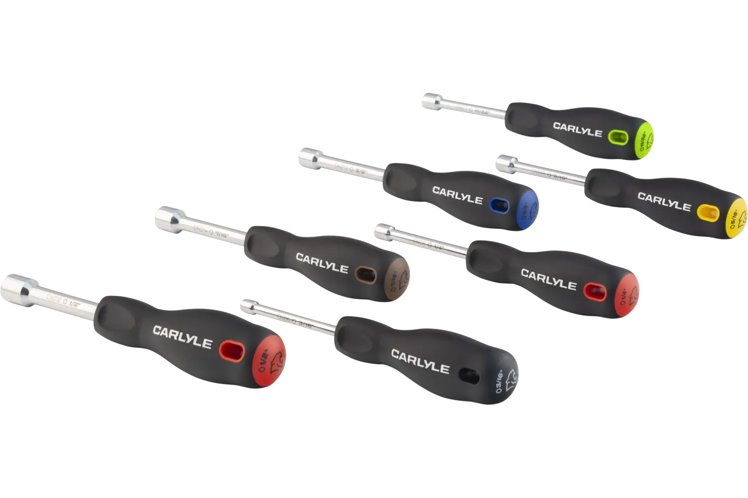 The Carlyle 7-Piece SAE Nut Driver Set is engineered for strength and precision, making it a must-have for any professional or DIY enthusiast. Constructed from durable CR-V steel, these nut drivers deliver exceptional torque and long-lasting performance. The comfort-grip, color-coded handles providing easy size identification and reduce hand fatigue during extended use. An integrated bolster hole in the handle allows for increased torque when needed. Finished with a high-polish chrome coating for rust resistance, this set combines durability, functionality, and ease of use for tackling tough tasks with confidence.