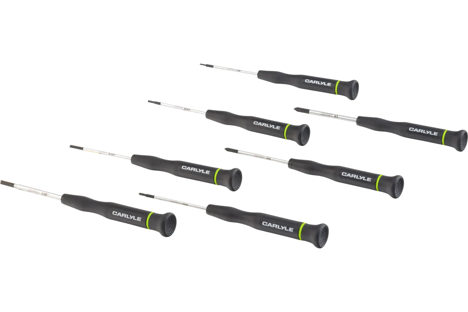 The Carlyle Phillips & Slotted Screwdriver Set is engineered for durability and precision, making it a must-have for professionals and DIY enthusiasts. Crafted from SVCM special alloy material, these screwdrivers are heat-treated and plated with a satin chrome finish for rust resistance and long-lasting performance. The magnetic tips provide superior fastener control, while the comfort-grip handles with swivel caps providing accuracy and ease of use. Designed for efficiency, this set includes low-profile screwdrivers with a 15° offset angle for accessing hard-to-reach fasteners. Complete with a tray for storage, this set is built to tackle tough tasks with confidence.