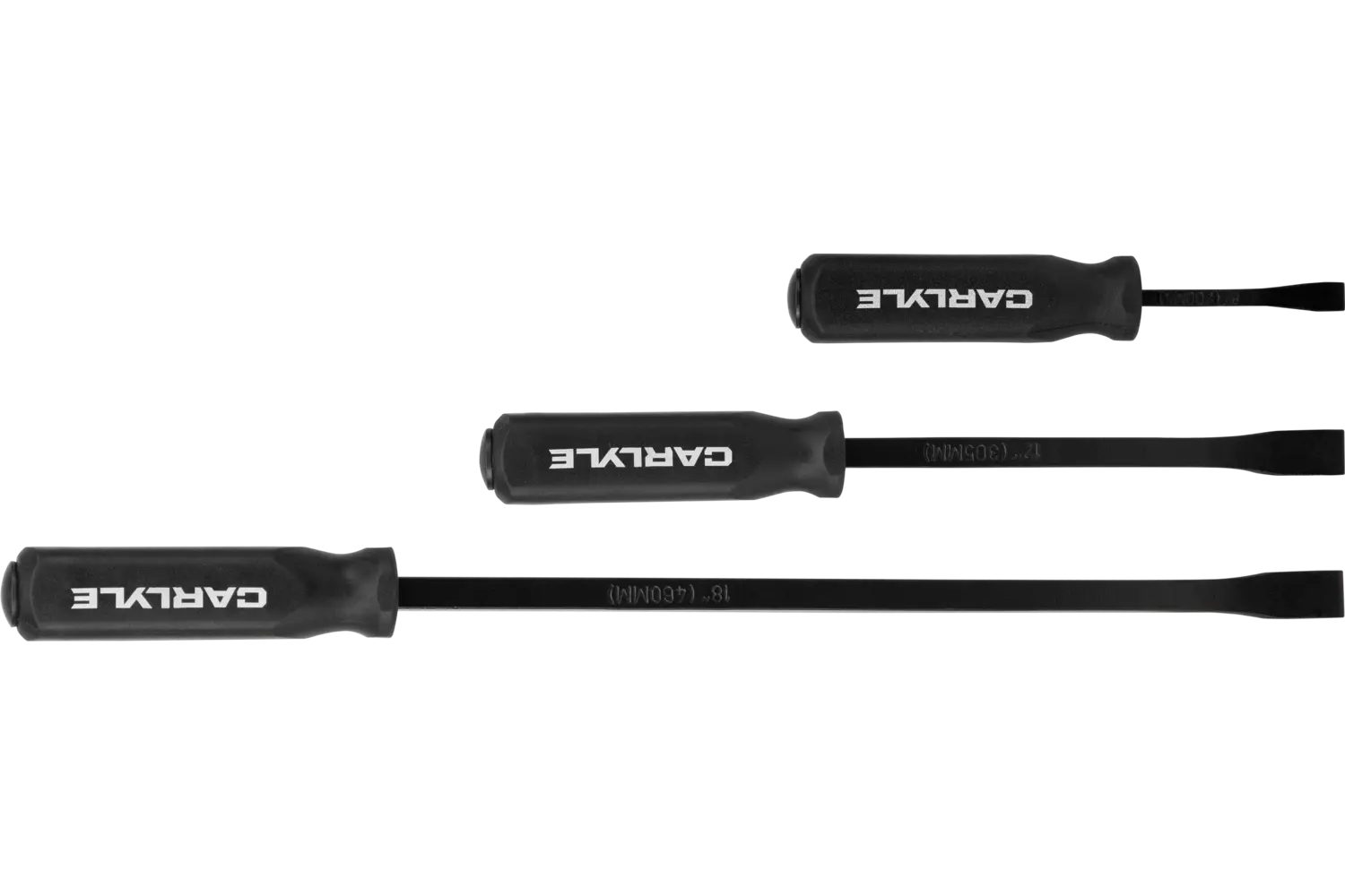 The Carlyle Pry Bar Set with Handles - Striking is a robust solution for heavy-duty prying tasks. Made from square section steel, these pry bars feature a blade that extends through the handle to form a solid striking surface. The metal striking cap allows for hammering without damaging the handle, while the black oxide finish resists rust and wear. The composite handle, made from durable materials, provides a comfortable grip for prolonged use. Available in 3-, 4-, or 6-piece sets, this collection is a valuable addition to any professional or DIY toolkit.