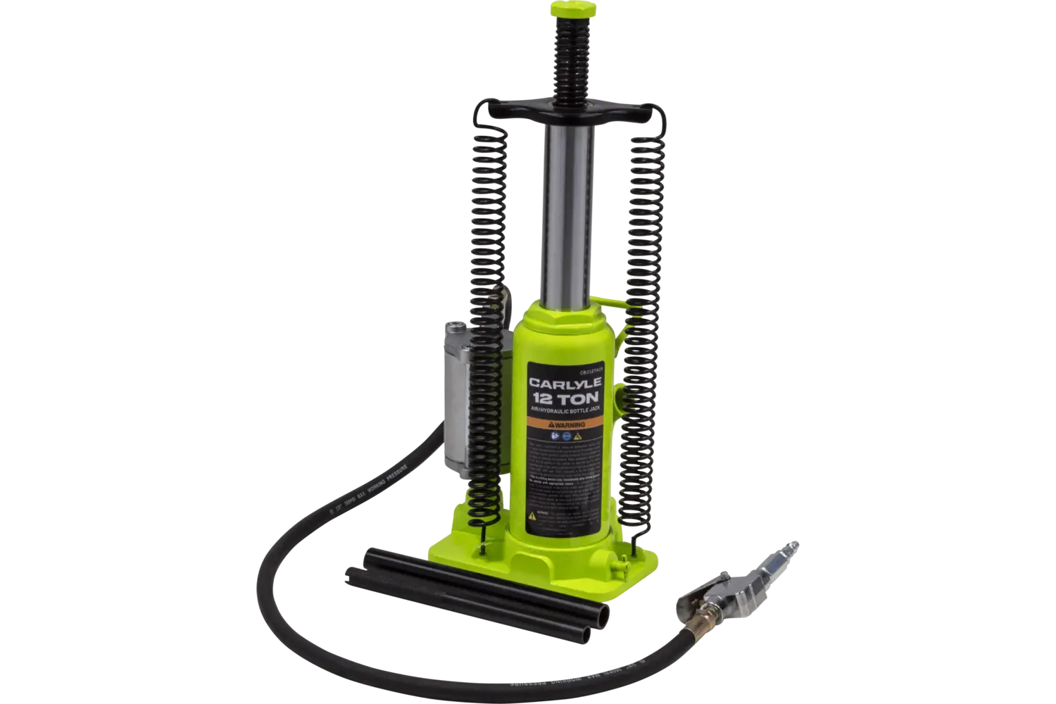 The Carlyle Air Hydraulic Bottle Jack is a durable tool for heavy-duty lifting tasks. Featuring a uni-weld cylinder and ram, it is built for strength and reliability. Available in multiple sizes, this jack is suitable for a variety of applications. With its rugged construction, it is a practical choice for mechanics and DIY enthusiasts working on demanding projects.