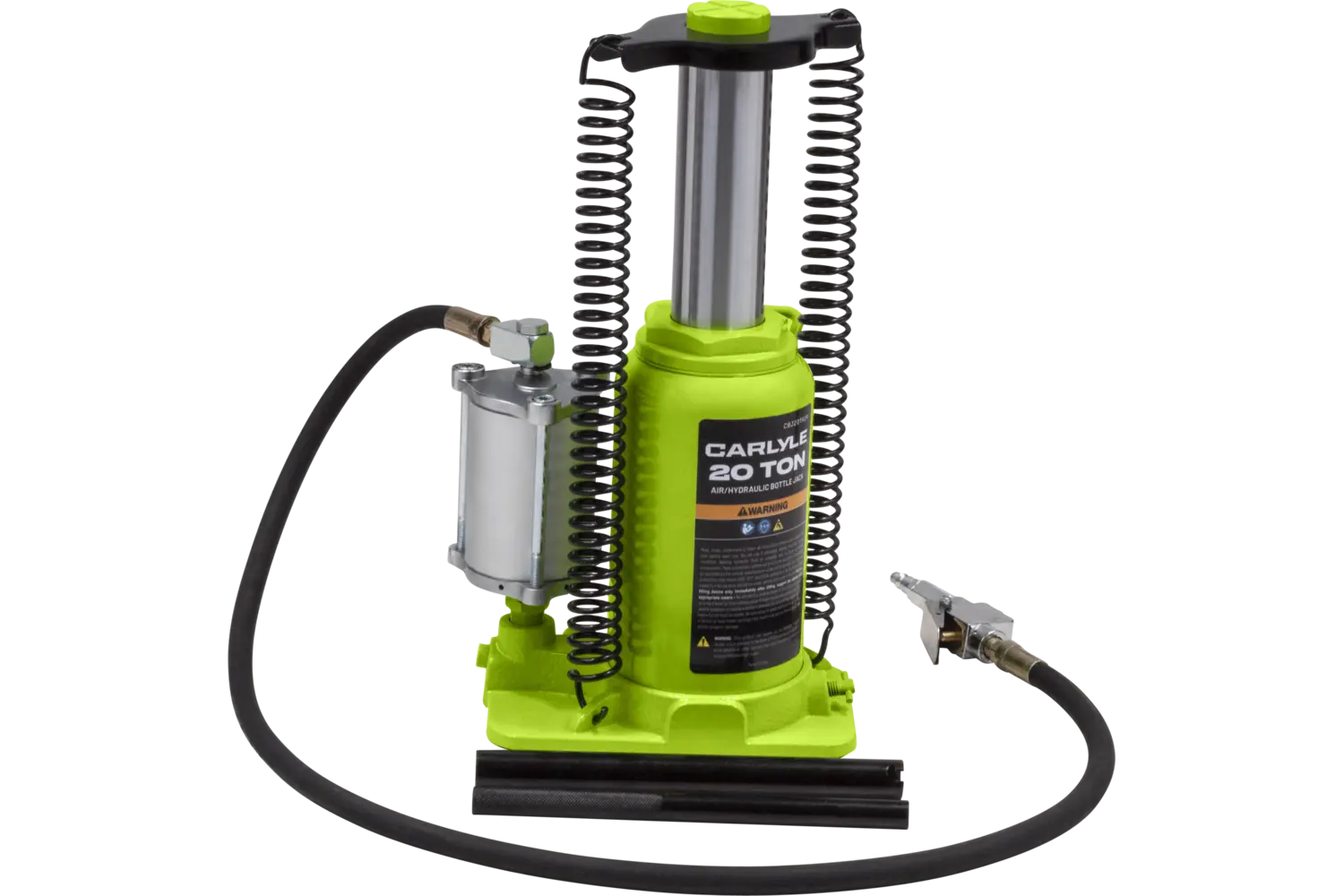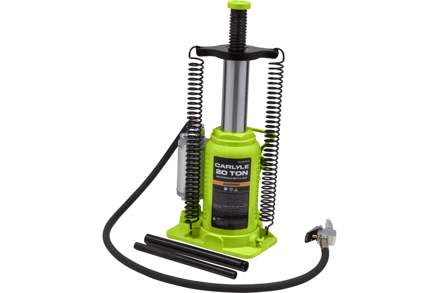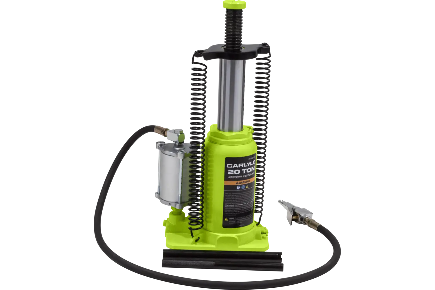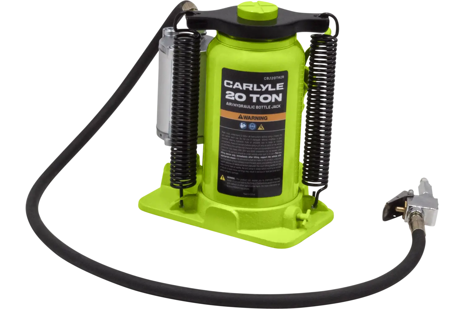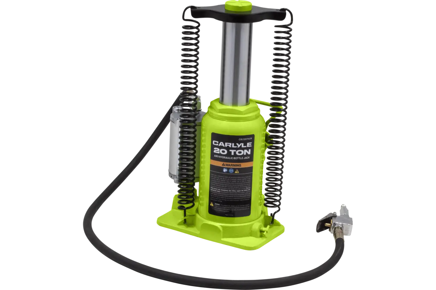 The Carlyle Air Hydraulic Bottle Jack is a durable tool for heavy-duty lifting tasks. Featuring a uni-weld cylinder and ram, it is built for strength and reliability. Available in multiple sizes, this jack is suitable for a variety of applications. With its rugged construction, it is a practical choice for mechanics and DIY enthusiasts working on demanding projects.