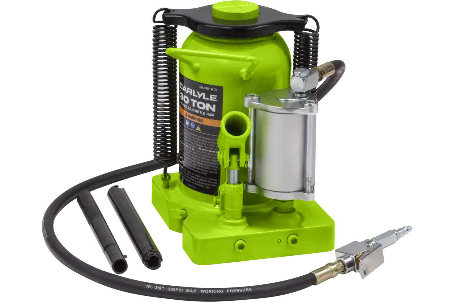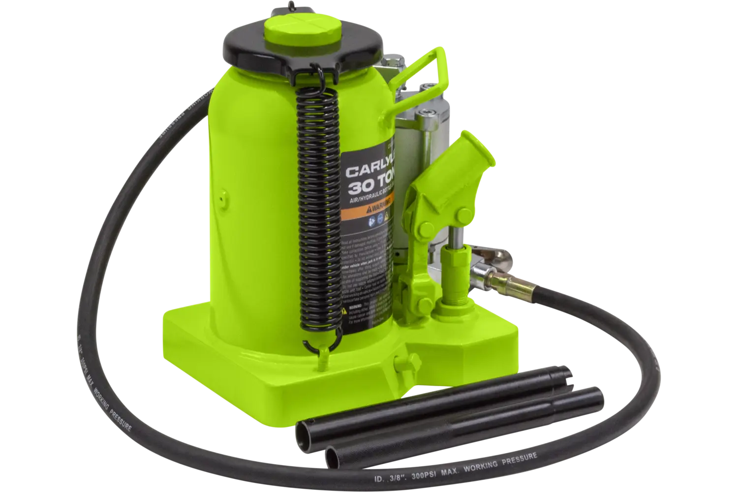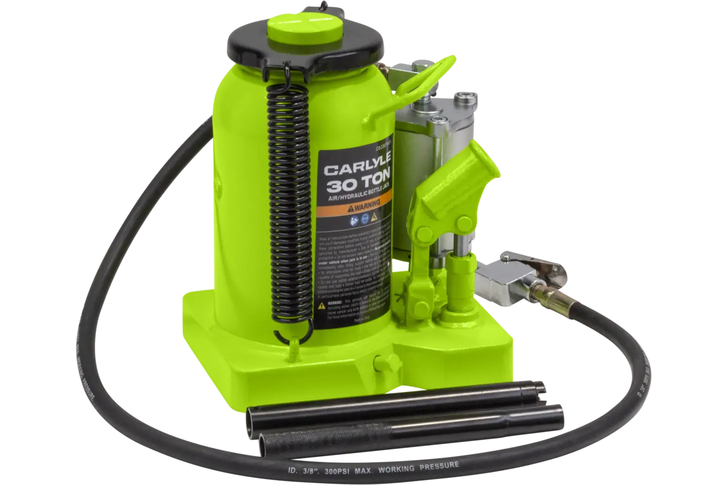 The Carlyle Air Hydraulic Bottle Jack is a durable tool for heavy-duty lifting tasks. Featuring a uni-weld cylinder and ram, it is built for strength and reliability. Available in multiple sizes, this jack is suitable for a variety of applications. With its rugged construction, it is a practical choice for mechanics and DIY enthusiasts working on demanding projects.