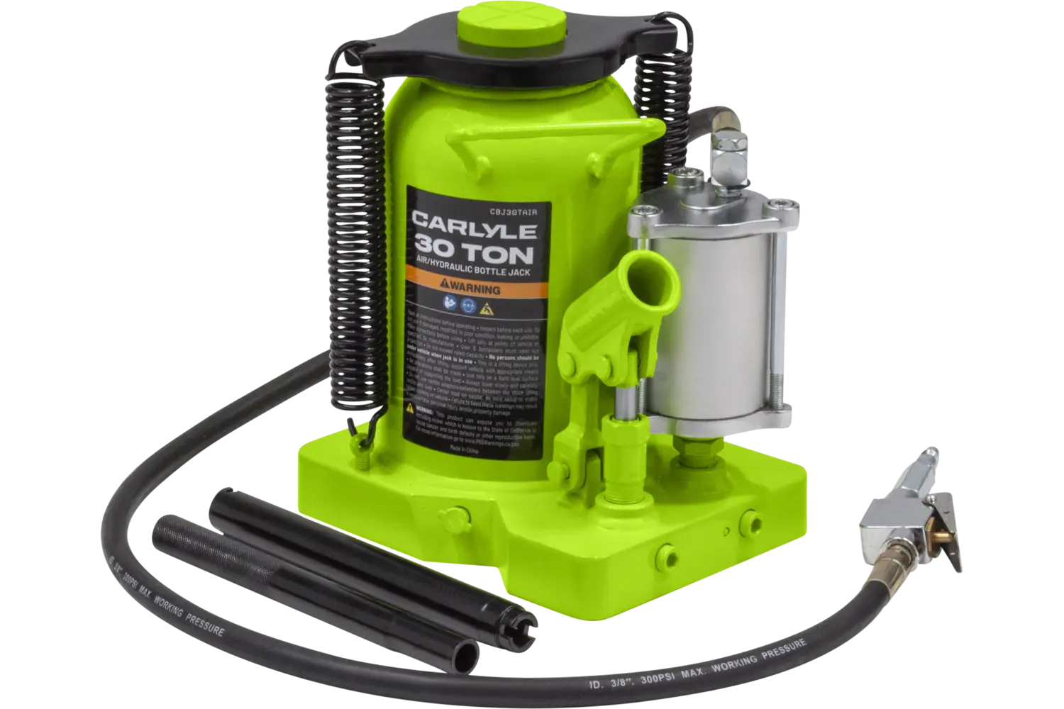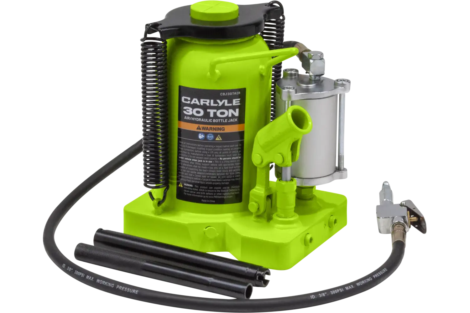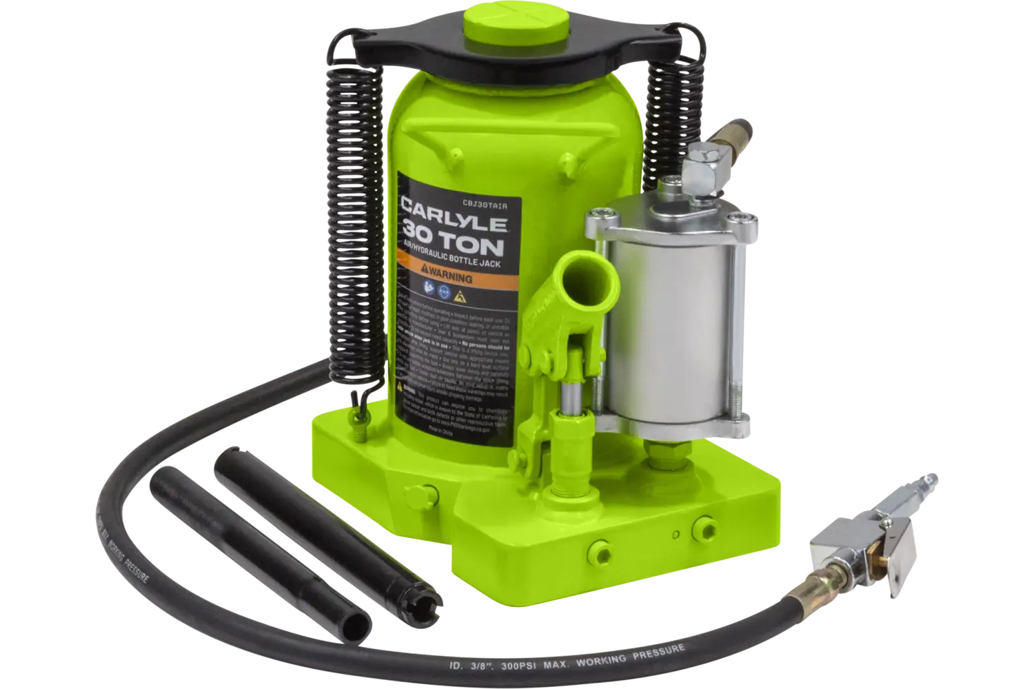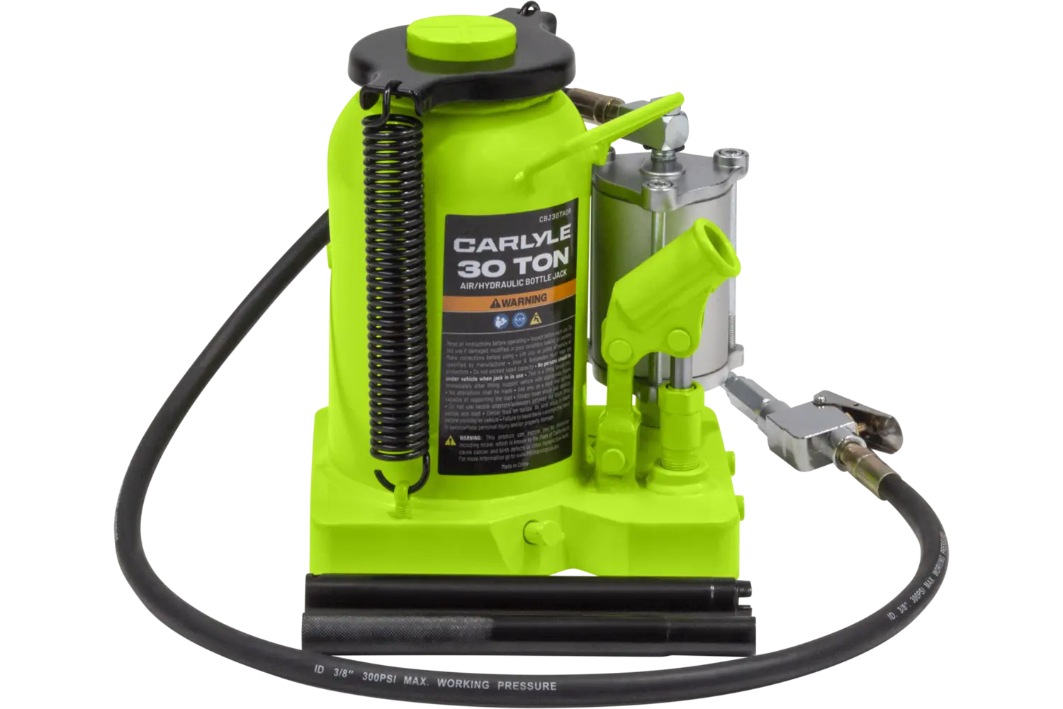 The Carlyle Air Hydraulic Bottle Jack is a durable tool for heavy-duty lifting tasks. Featuring a uni-weld cylinder and ram, it is built for strength and reliability. Available in multiple sizes, this jack is suitable for a variety of applications. With its rugged construction, it is a practical choice for mechanics and DIY enthusiasts working on demanding projects.
