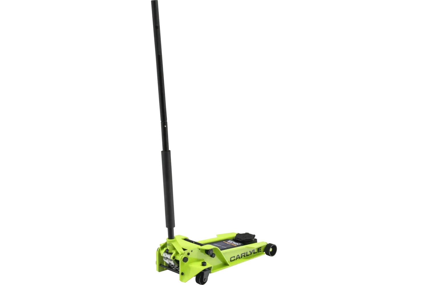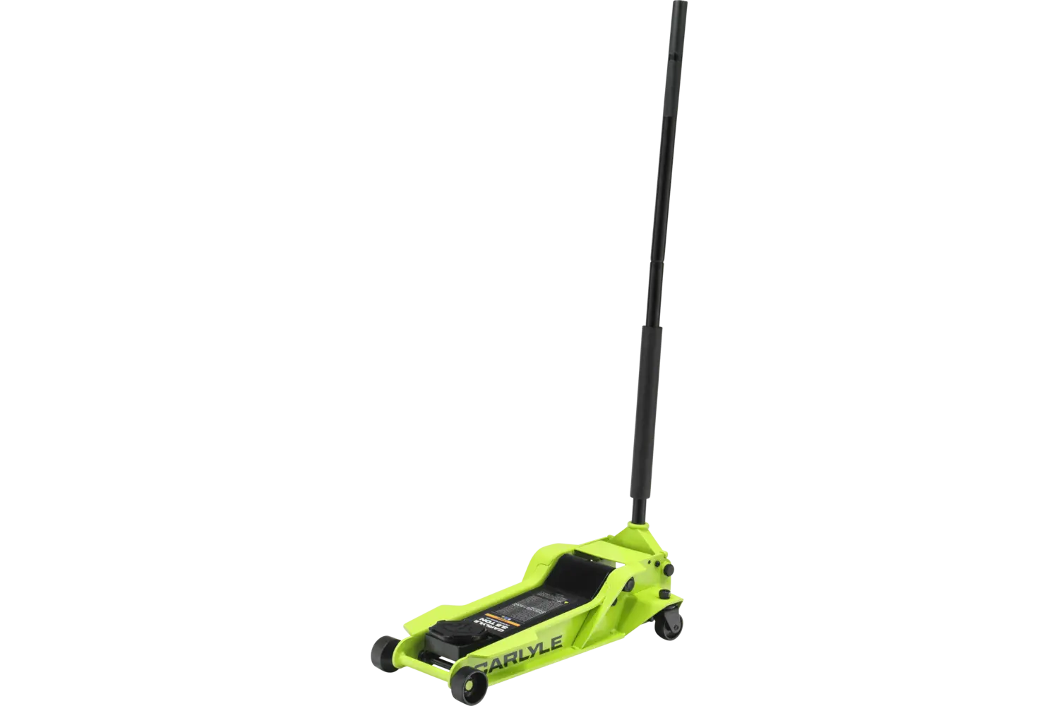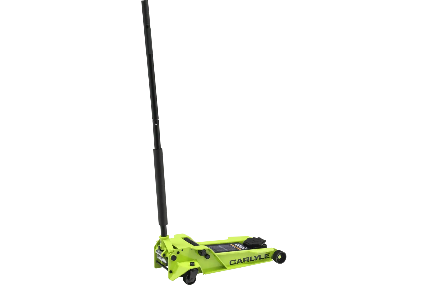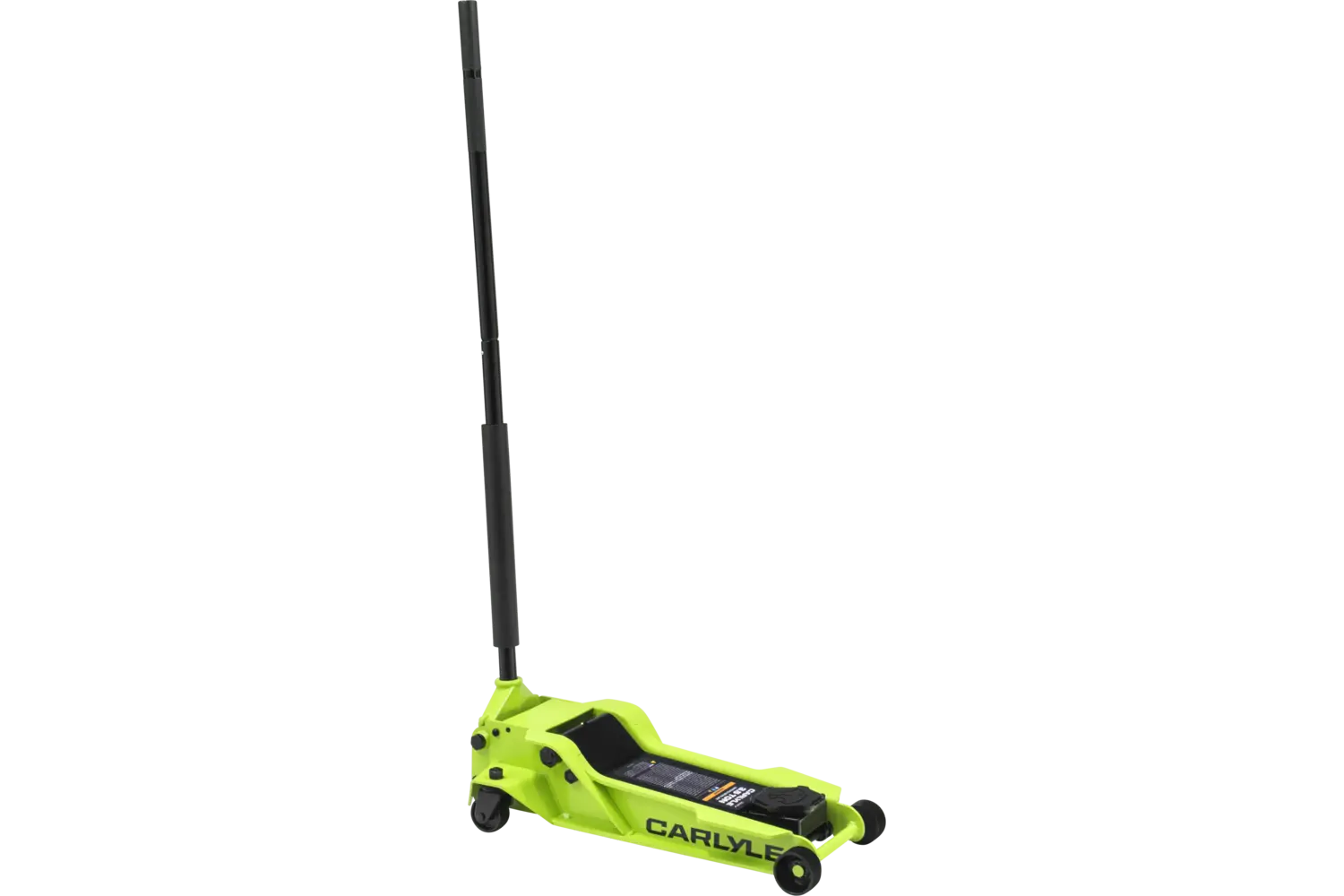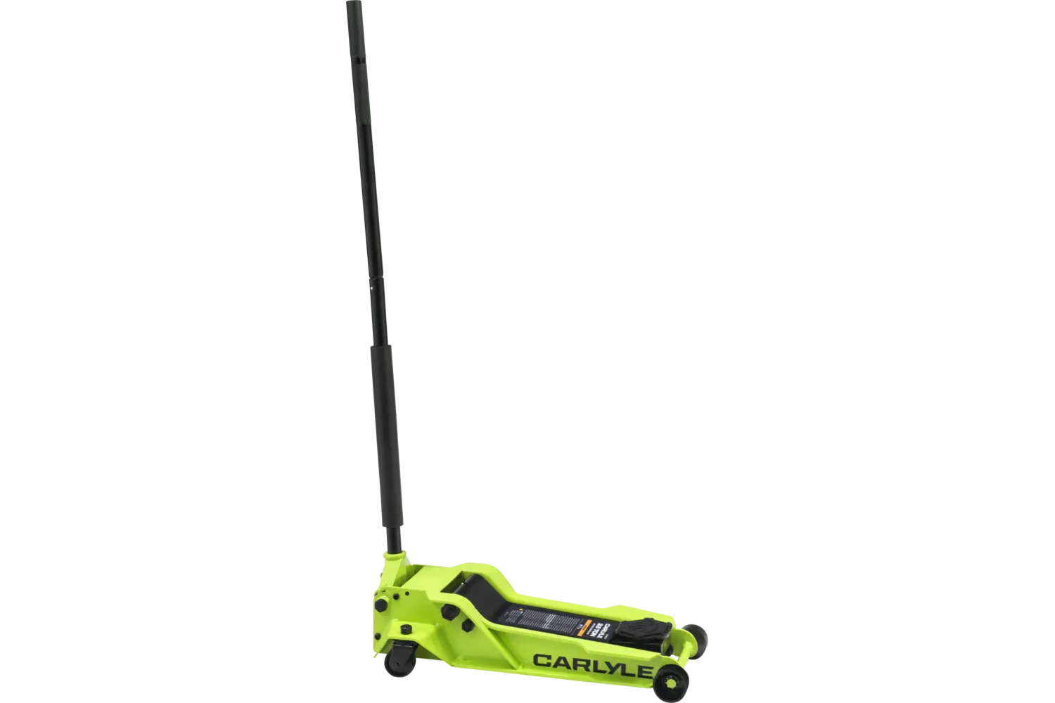 The Carlyle Hydraulic Floor Jack is a practical tool for lifting vehicles. Designed with a low-profile frame, it provides access under vehicles with low ground clearance. The long lift arm offers superior reach, while the front wheel design reduces rolling resistance. Featuring a two-piece handle and a rubber insert pad, this jack protects vehicle components during use. Available in multiple sizes, it is a reliable choice for mechanics and DIY enthusiasts.