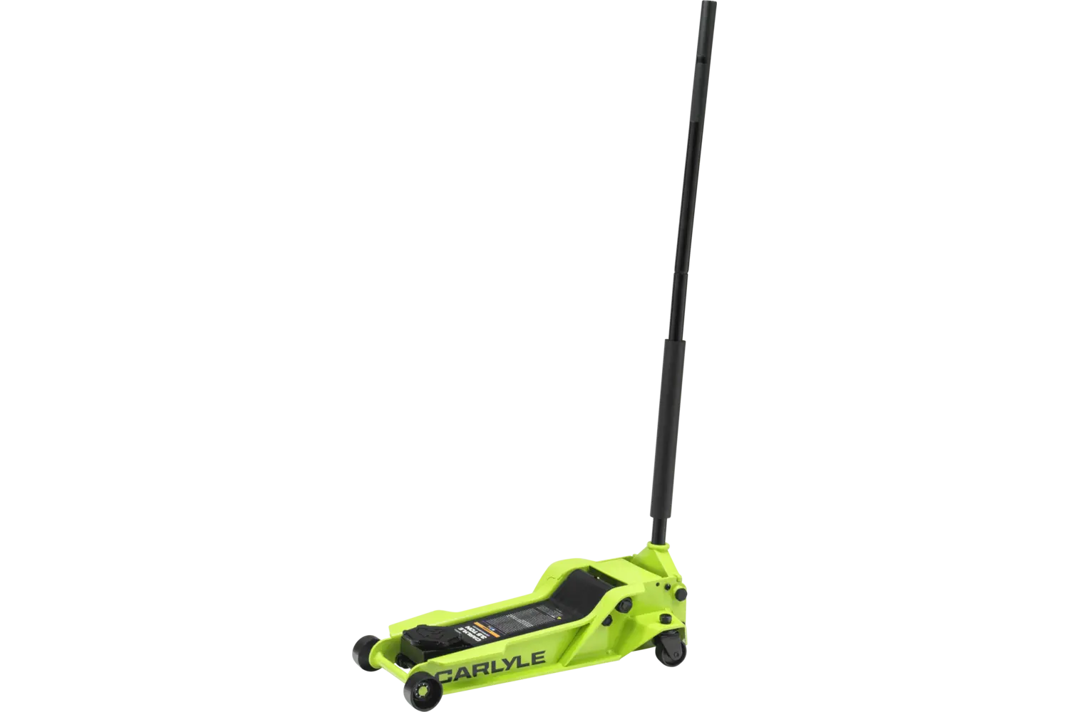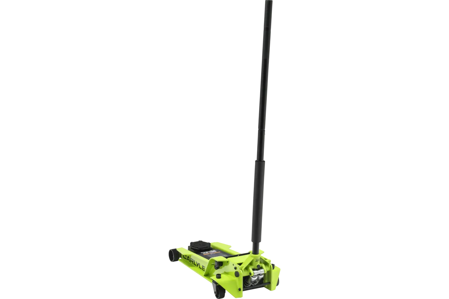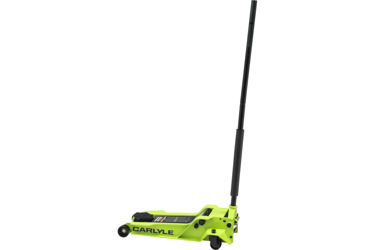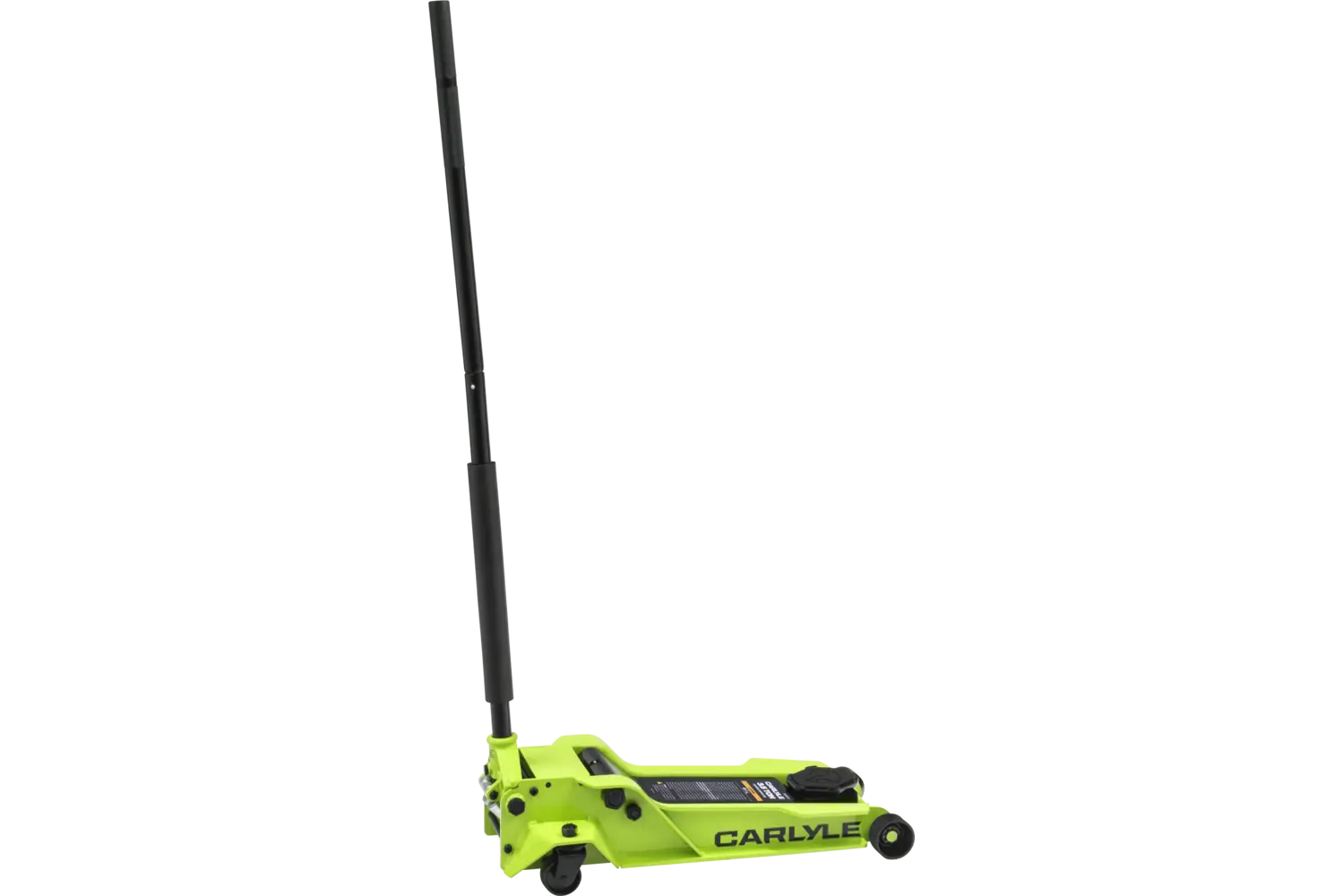 The Carlyle Hydraulic Floor Jack is a practical tool for lifting vehicles. Designed with a low-profile frame, it provides access under vehicles with low ground clearance. The long lift arm offers superior reach, while the front wheel design reduces rolling resistance. Featuring a two-piece handle and a rubber insert pad, this jack protects vehicle components during use. Available in multiple sizes, it is a reliable choice for mechanics and DIY enthusiasts.