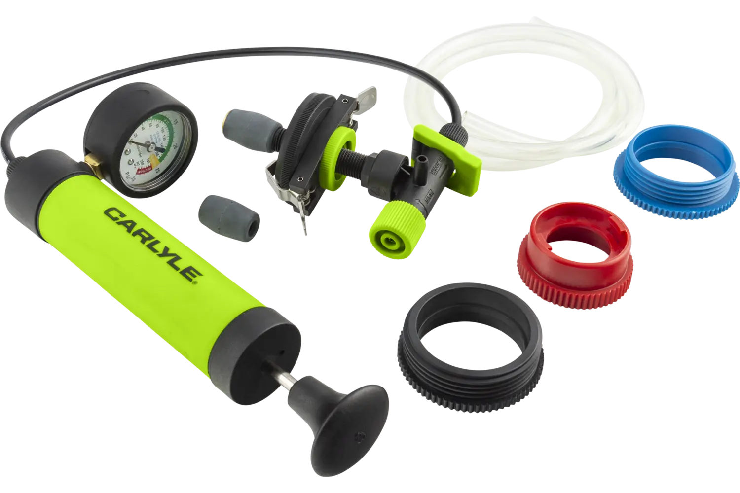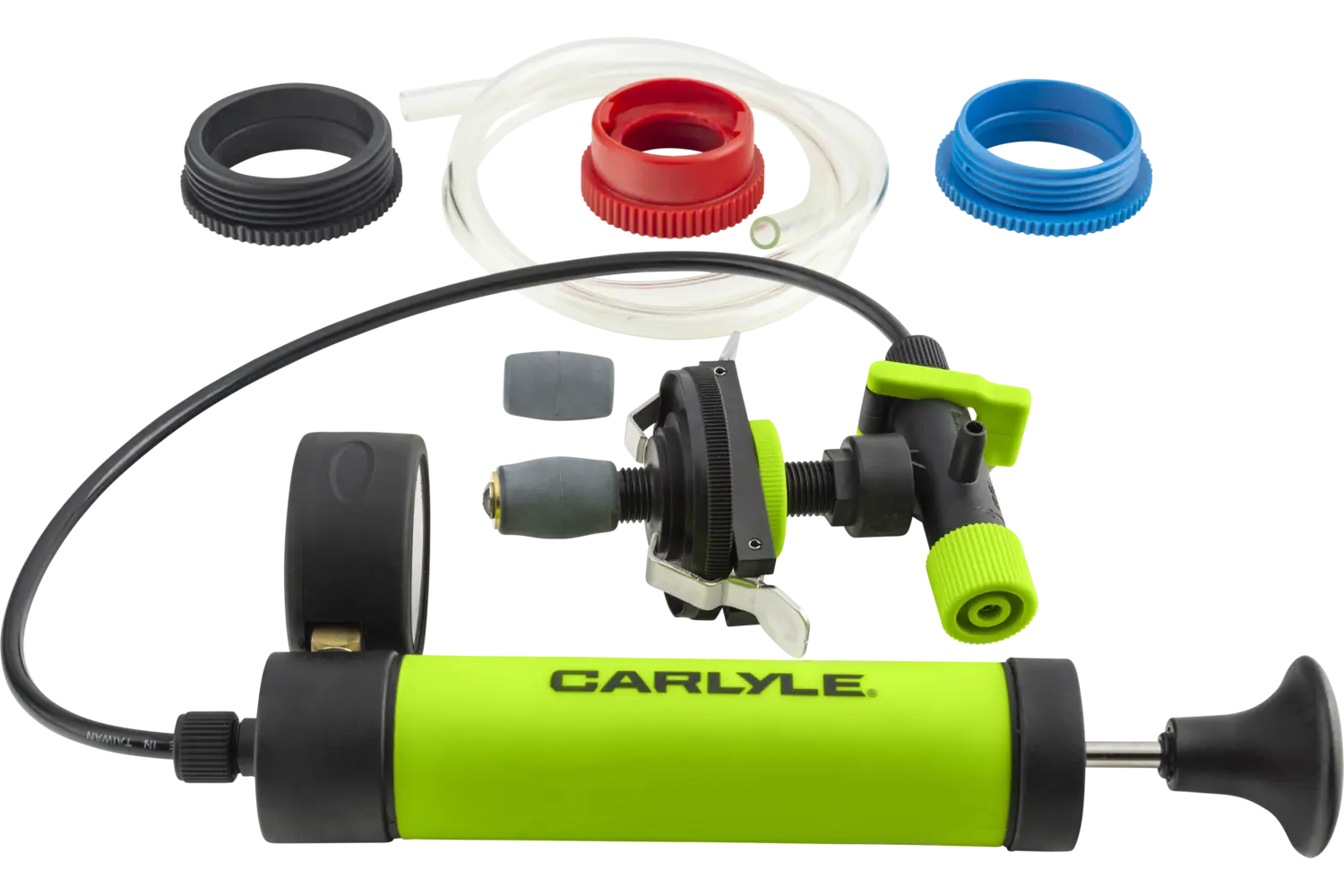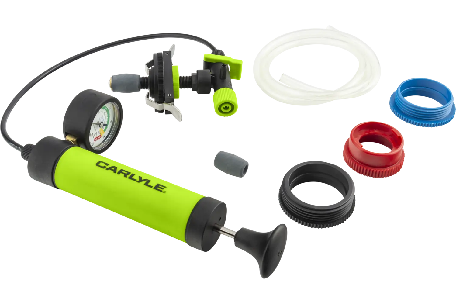 The Carlyle Cooling System Pressure Tester is the ultimate tool for those who demand rugged reliability and precision in diagnosing cooling system issues. This universal tester, crafted from fiberglass reinforced composite material, features an innovative inflatable bladder that securely attaches to radiator or header tanks, fitting both bayonet and threaded filler necks with ease. Designed to handle radiator neck diameters up to 1 3/4" and a maximum pressure of 30 psi, it’s perfect for automotive, commercial, heavy-duty, marine, and motorcycle applications. The rubber gauge jacket provides added protection against damage, while the fluid drain tube allows for easy coolant return to the reservoir or safe collection for recycling. With the Carlyle Cooling System Pressure Tester, identifying pressure leaks in your cooling system is both efficient and reliable, making it an essential addition to any pro mechanic's or DIY enthusiast's toolkit.