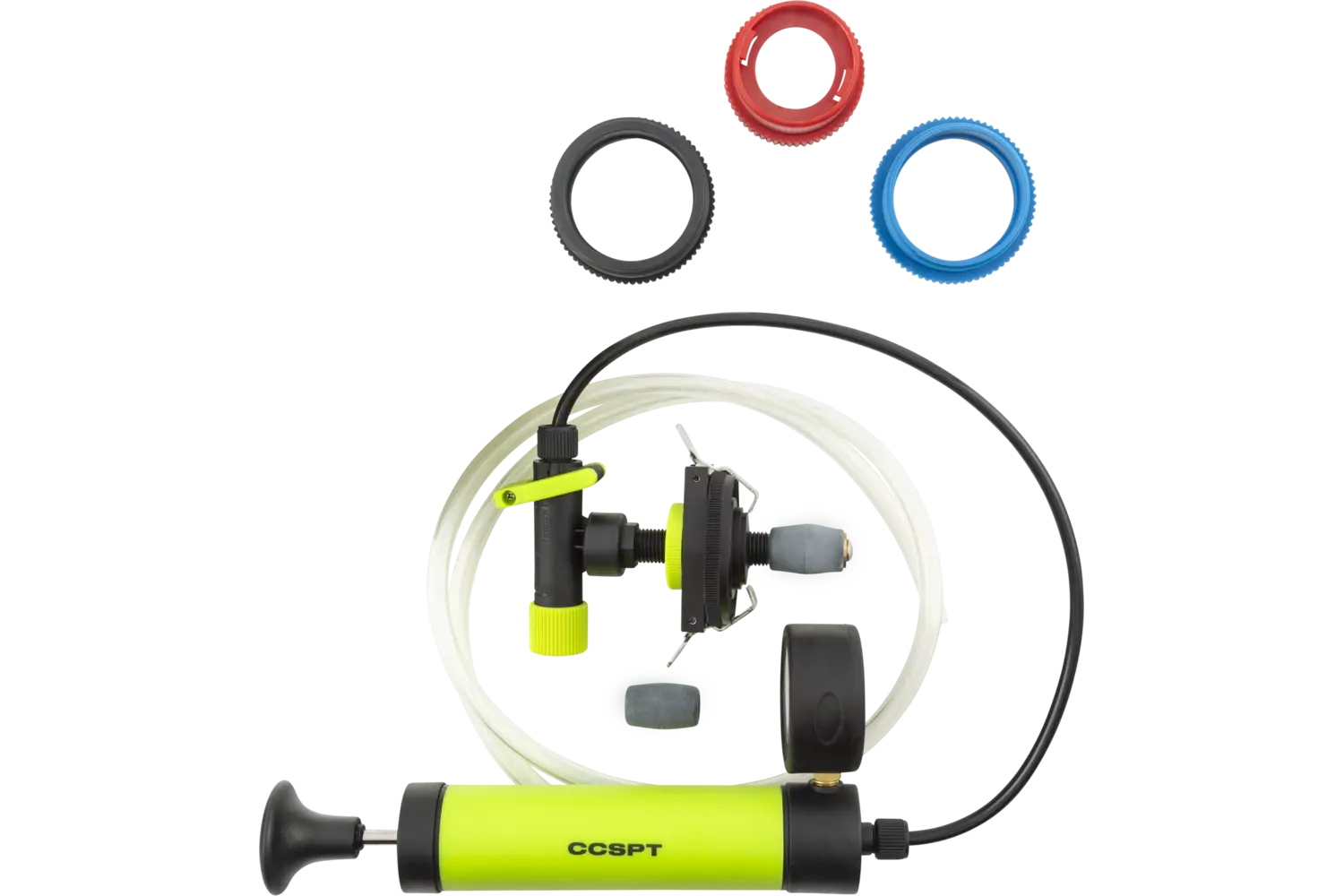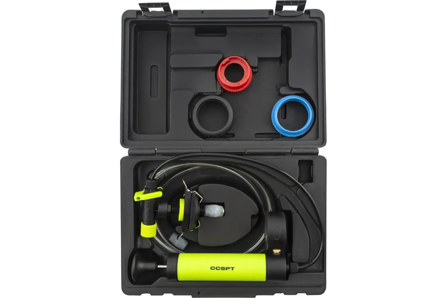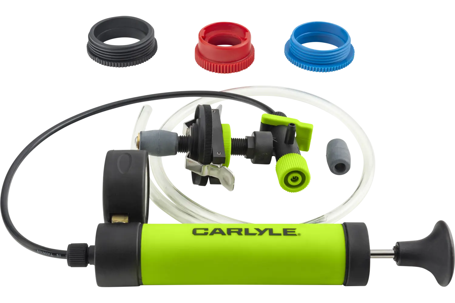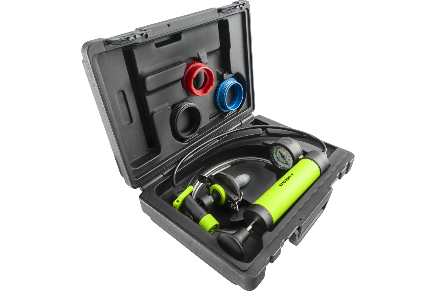 The Carlyle Cooling System Pressure Tester is the ultimate tool for those who demand rugged reliability and precision in diagnosing cooling system issues. This universal tester, crafted from fiberglass reinforced composite material, features an innovative inflatable bladder that securely attaches to radiator or header tanks, fitting both bayonet and threaded filler necks with ease. Designed to handle radiator neck diameters up to 1 3/4" and a maximum pressure of 30 psi, it’s perfect for automotive, commercial, heavy-duty, marine, and motorcycle applications. The rubber gauge jacket provides added protection against damage, while the fluid drain tube allows for easy coolant return to the reservoir or safe collection for recycling. With the Carlyle Cooling System Pressure Tester, identifying pressure leaks in your cooling system is both efficient and reliable, making it an essential addition to any pro mechanic's or DIY enthusiast's toolkit.