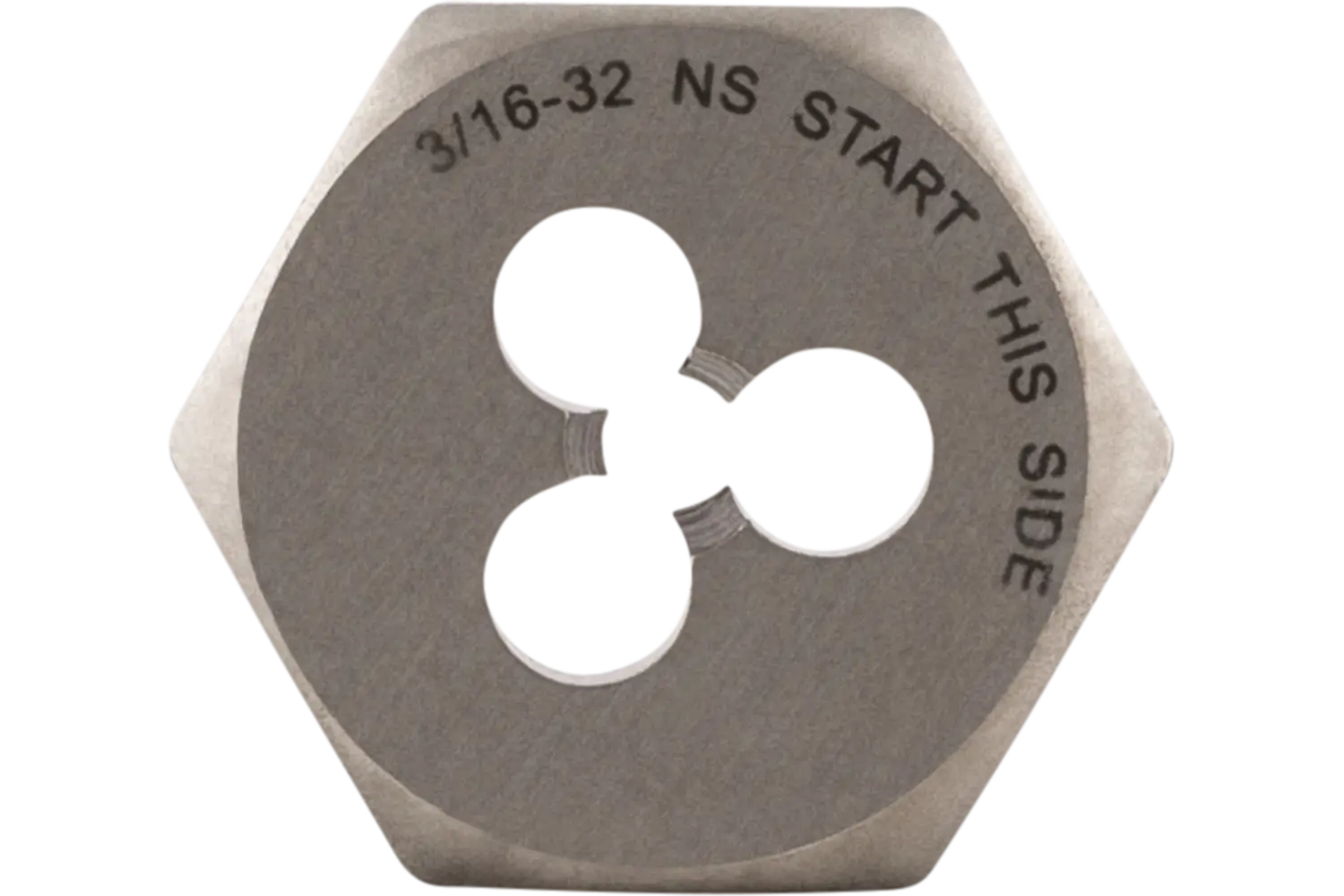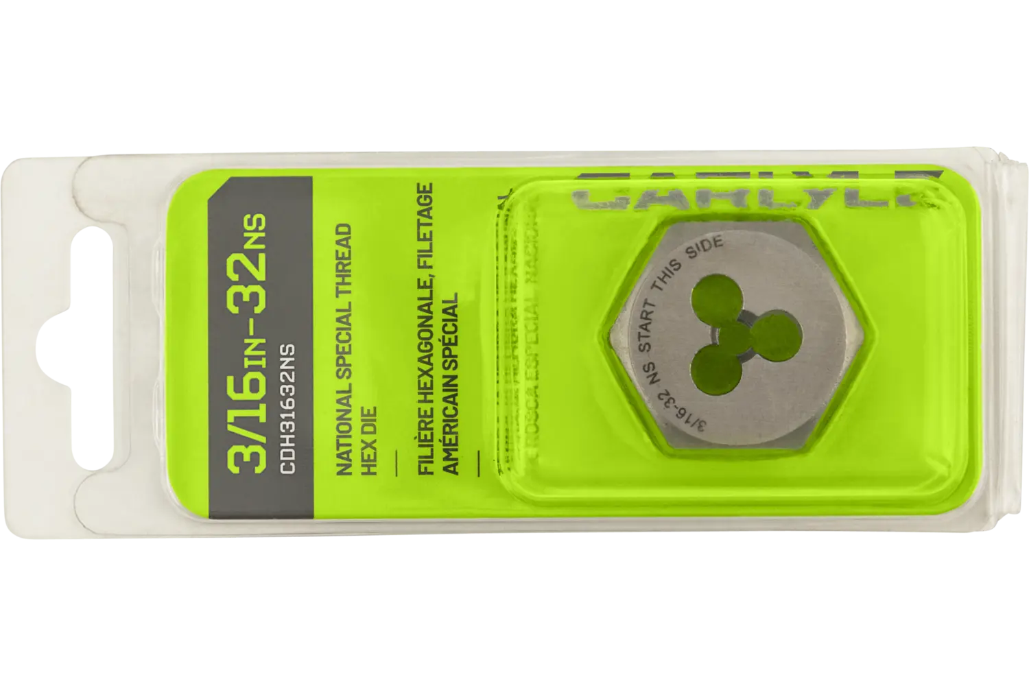 The Carlyle Hexagonal Machine Screw Fractional Die is a dependable tool for cutting external threads with precision. Made from tough carbon tool steel, this die is built for durability and long-lasting use. Its hexagon shape makes it easy to use with a die stock or adjustable wrench, offering flexibility for different tasks. Available in various sizes, this die is a practical addition to any toolkit.