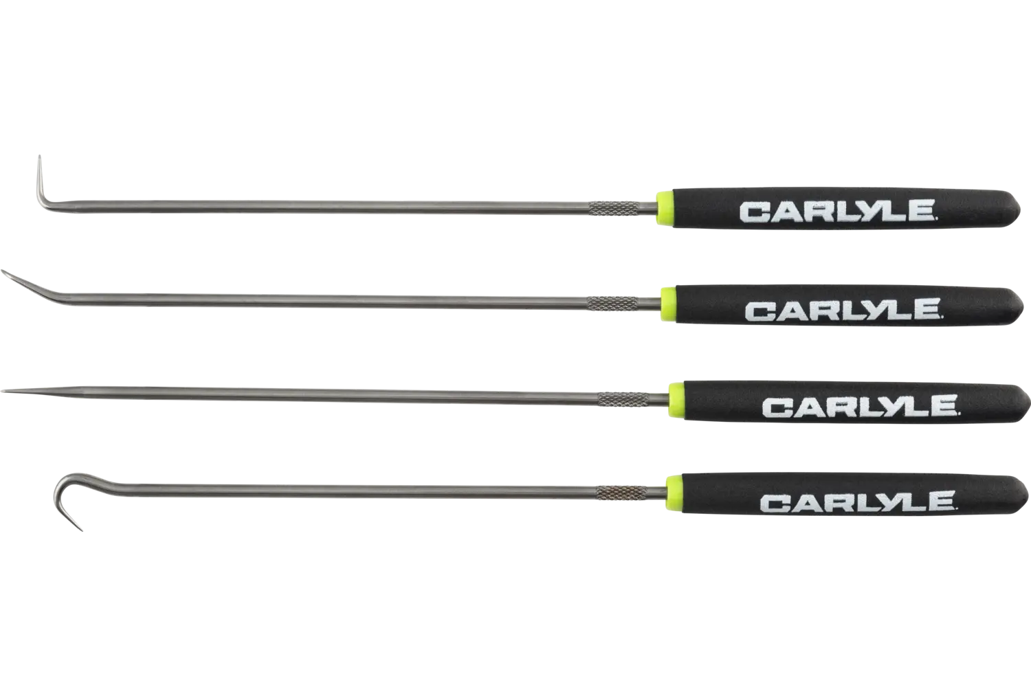 Upgrade your toolkit with the Carlyle Tools Hook & Pick Set, a versatile collection for automotive technicians. Available in 3-, 4-, 5-, 6-, or 7-piece sets, these tools are crafted from heat-treated, high-carbon steel for durability and strength. Designed for tasks such as pulling O-rings, seals, and cotter pins, the corrosion-resistant zinc-plated picks are built for efficiency. Each tool features a cushion grip for better handling, even in wet or oily conditions. This set is a practical addition to your toolkit, offering reliable performance for a wide range of applications.