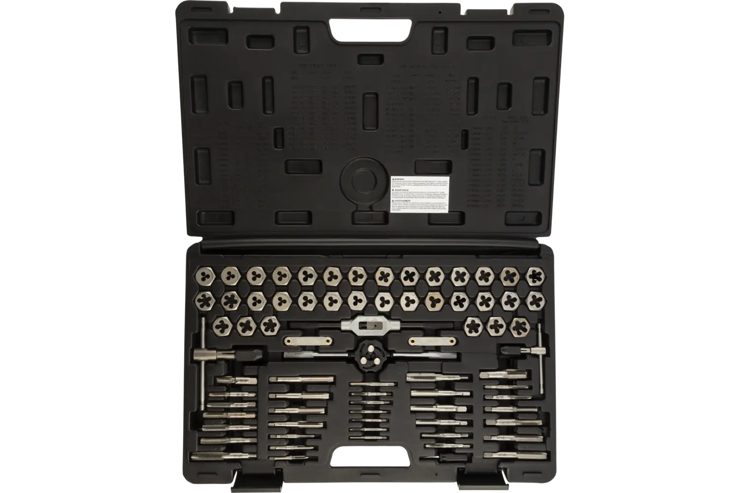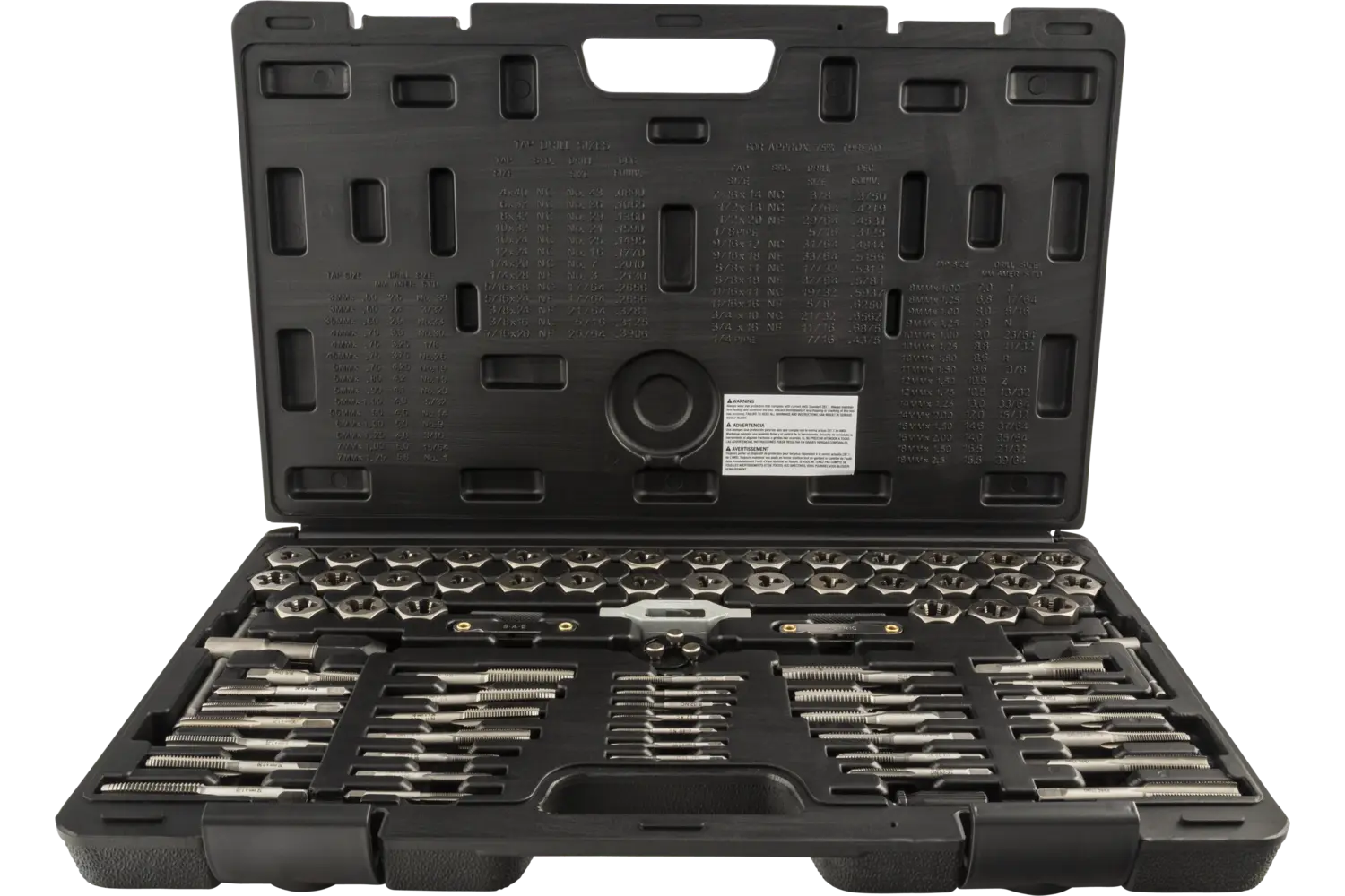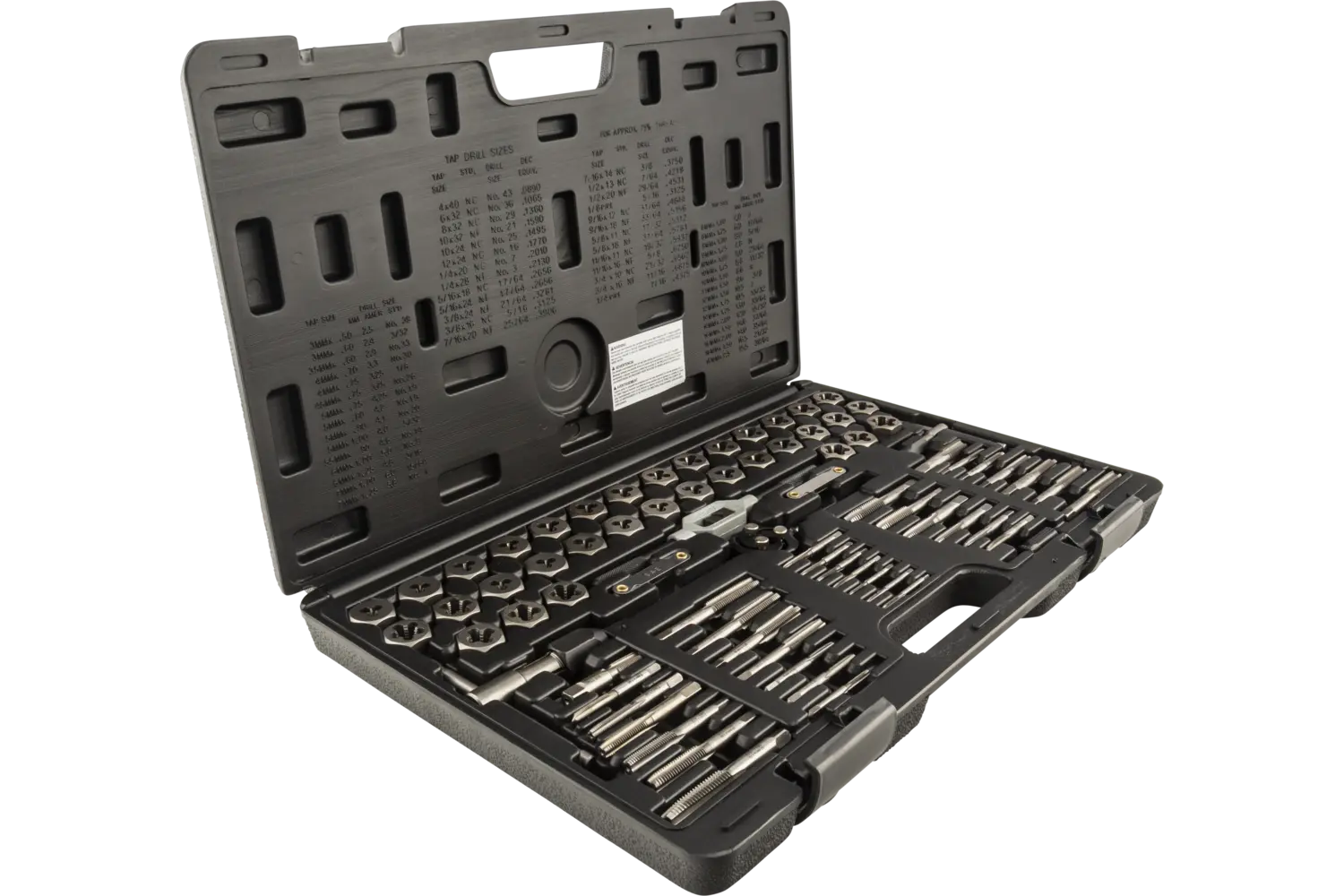 6-32NC, 8-32NC, 10-24NC, 10-32NF, 12-24NC, 3/4in-16NF, 1/4in-20NC, 5/16in-18NC, 3/8in-16NC, 7/16in-14NC, 1/2in-13NC, 1/4in-28NF, 5/16in-24NF, 3/8in-24NF, 7/16in-20NF, 1/2in-20NF, 9/16in-12NC, 5/8in-11NC, 3/4in-10NC, 9/16in-18NF, 5/8in-18NF, 1/8in-27NPT, 1/4in-18NPT, 6-32NC, 8-32NC, 10-24NC, 10-32NF, 12-24NC, 1/4-20NC, 5/16-18NC, 3/8-16NC, 7/16-14NC, 1/2-13NC, 1/4-28NF, 5/16-24NF, 3/8-24NF, 7/16-20NF, 1/2-20NF, 9/16-12NC, 9/16-18NF, 5/8-11NC, 5/8-18NF, 3/4-10NC, 3/4-16NF, 1/8in-27NPT, 1/4in-18NPT, 1in Adjustable Stock Hex Die Wrench, 1-7/16in Adjustable Stock Hex Die Wrench, 0-1/4in Range T-Handle Tap Wrench, 0-1/2in Range 8-3/4in Adjustable Tap & Reamer Wrench, 1/4in - 3/4in Range 14-5/8in Adjustable Tap & Reamer Wrench, SAE Thread Pitch Gauge, #5 Screwdriver, #5 17/64in Drill, #4 1/4in Drill, #3 5/32in Drill, #2 7/64in Drill, #1 5/64in Drill