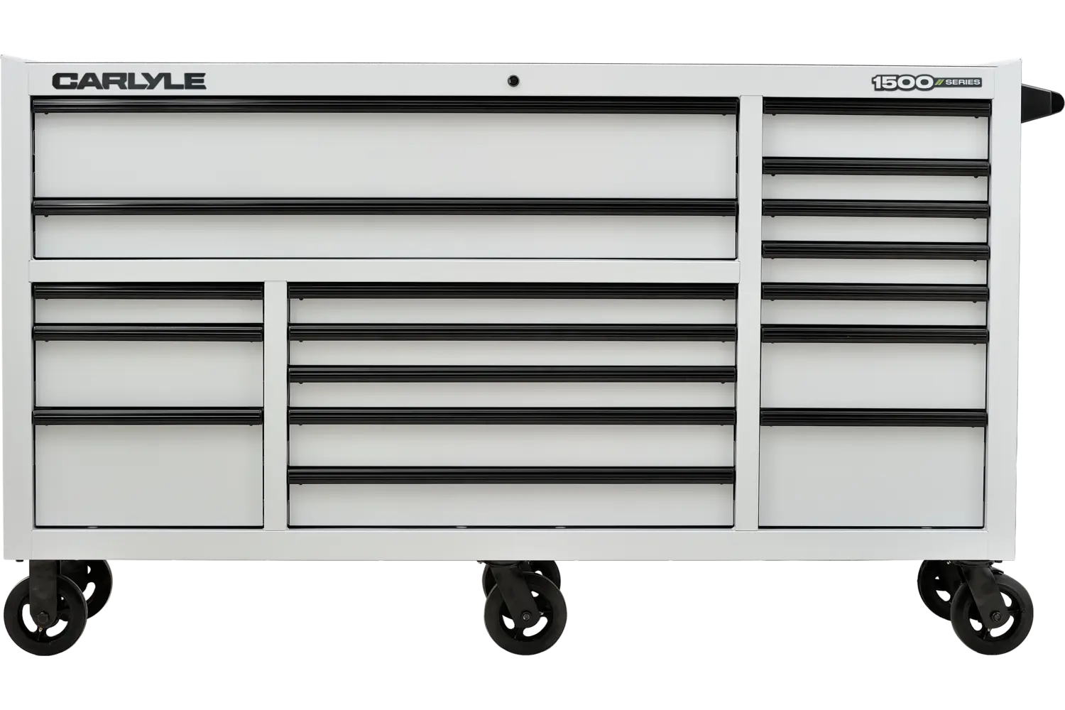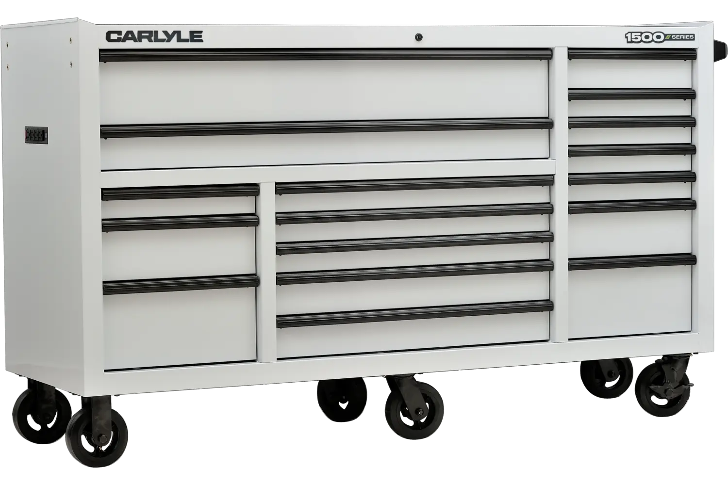Built for pros who demand toughness and functionality, the Carlyle 1500 Series Roller Cabinet delivers massive storage capacity and rugged durability to handle any job. Constructed with a strong steel frame and 18-gauge steel drawers, each approximately 24” deep, this cabinet supports over 1,390kg of tools and gear. Premium ball-bearing slides on every drawer handle up to 56kg, while the internal high-security keyed locking system keeps your tools safe. Equipped with a built-in power bank featuring 4 outlets and 2 fast-charging USB ports, it keeps your tools and devices powered up while you work. Heavy-duty caster wheels and a steel tubular side handle make mobility effortless, and logo-embossed PVC drawer liners keep your tools organized and secure. Available in 41", 54", or 72" sizes and bold colors like Gritty Gray, Midnight Oil, or Venom Green, this roller cabinet is built to dominate any shop or garage.
