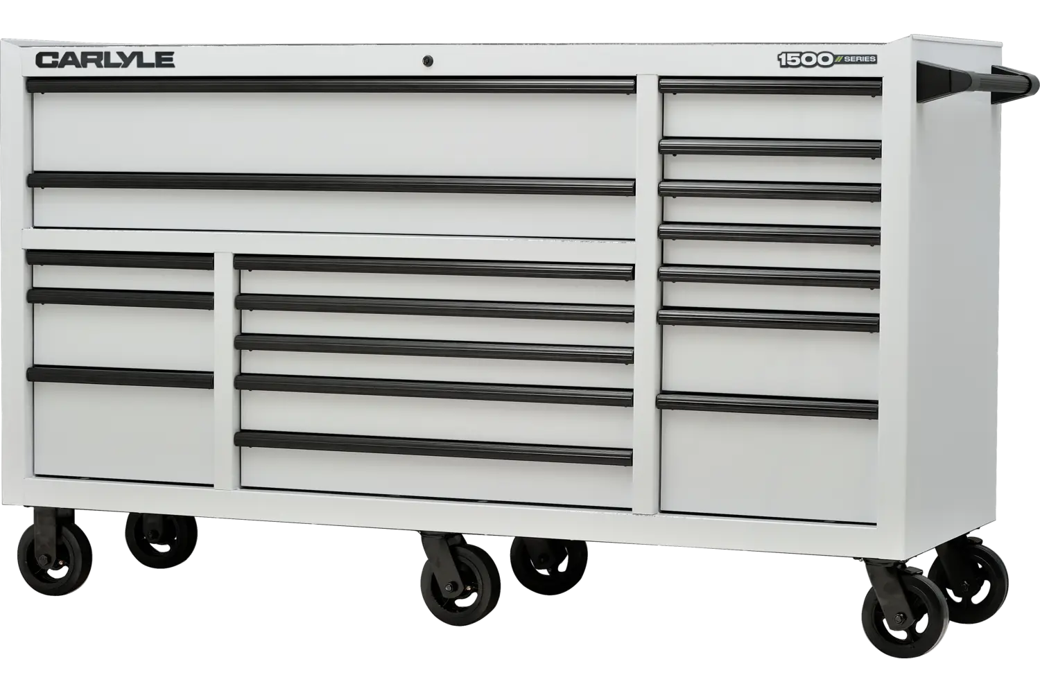 Built for pros who demand toughness and functionality, the Carlyle 1500 Series Roller Cabinet delivers massive storage capacity and rugged durability to handle any job. Constructed with a strong steel frame and 18-gauge steel drawers, each approximately 24” deep, this cabinet supports over 1,390kg of tools and gear. Premium ball-bearing slides on every drawer handle up to 56kg, while the internal high-security keyed locking system keeps your tools safe. Equipped with a built-in power bank featuring 4 outlets and 2 fast-charging USB ports, it keeps your tools and devices powered up while you work. Heavy-duty caster wheels and a steel tubular side handle make mobility effortless, and logo-embossed PVC drawer liners keep your tools organized and secure. Available in 41", 54", or 72" sizes and bold colors like Gritty Gray, Midnight Oil, or Venom Green, this roller cabinet is built to dominate any shop or garage.
