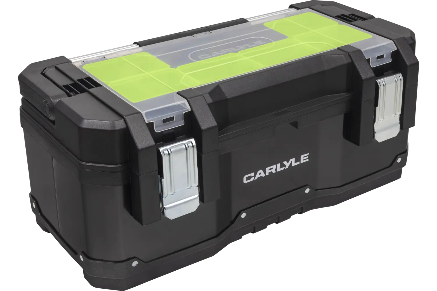 The Carlyle Tool Box Organizer is built to handle the toughest jobs while keeping your tools secure and organized. Featuring a durable polycarbonate lid, it lets you easily identify the contents at a glance, while the integrated weather-proof seal protects your gear from harsh elements, providing long-lasting performance. The unique lid design keeps everything in its place, even during transport, and the built-in shock-absorbing feet reduce wear and tear, extending the life of the unit. With 6, 8, or 9 removable tubs, it offers up to 8 different sections of customizable storage, making it perfect for pros and DIYers who demand rugged reliability and smart organization.